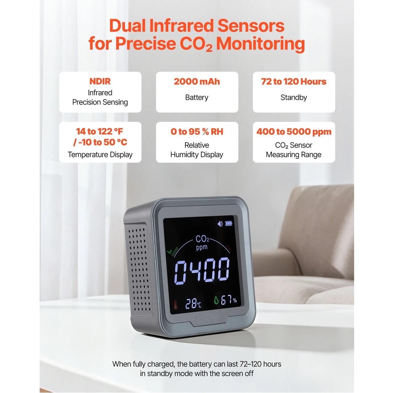 Detectare stabila a CO₂: Mentineti calitatea aerului din interior sub control cu acest monitor de CO₂ pentru acasa. Senzorii dubli cu infrarosu masoara CO₂ cu precizie intre 400 si 5000 ppm, in timp ce afisarea simultana a temperaturii si umiditatii asigura date stabile, clare si usor de citit despre mediul interior.