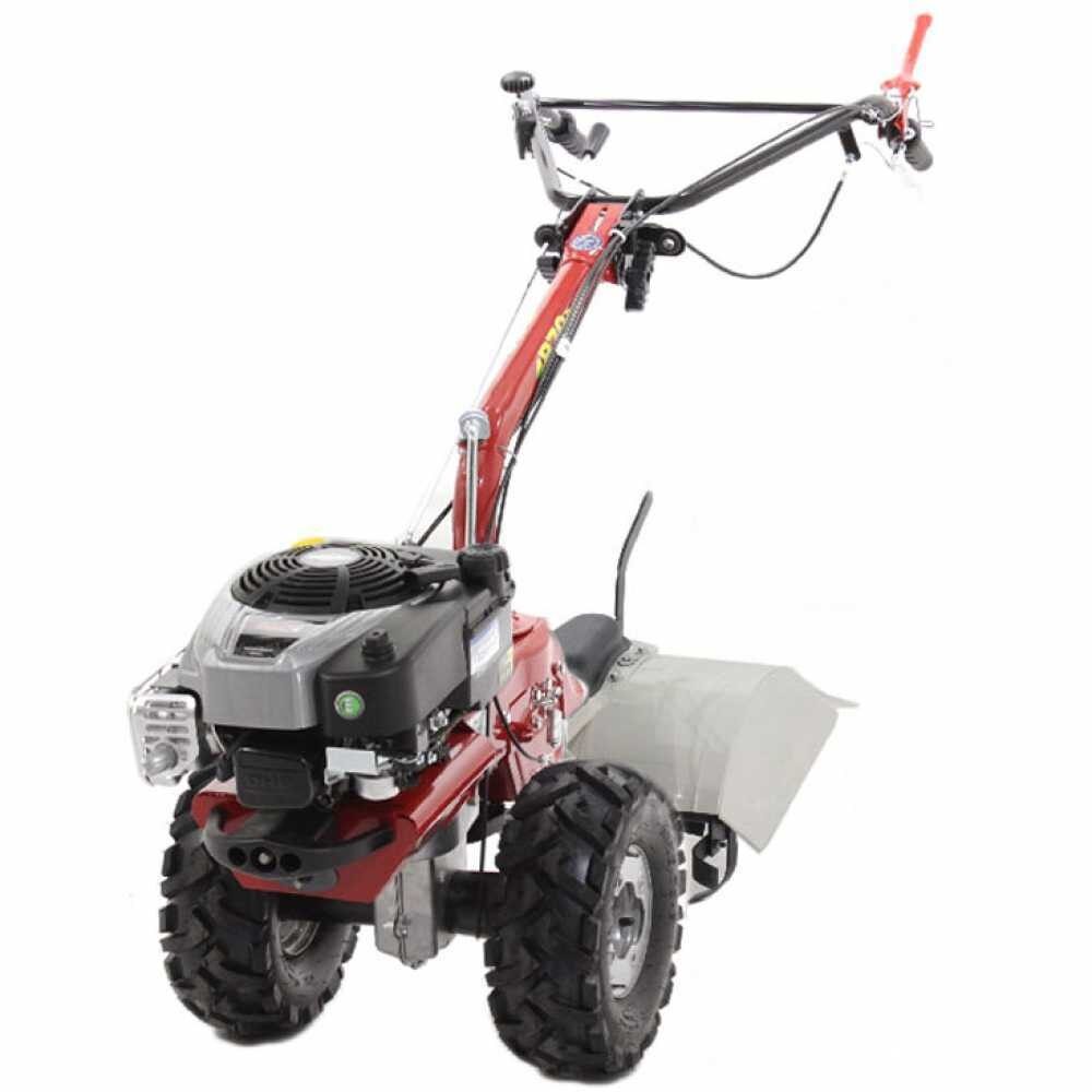 Cultivator rotativ autopropulsat cu motor pe benzina in 4 timpi, actionat de roti mari sculptate cu tractiune conectate la o transmisie cu roti dintate in baie de ulei.