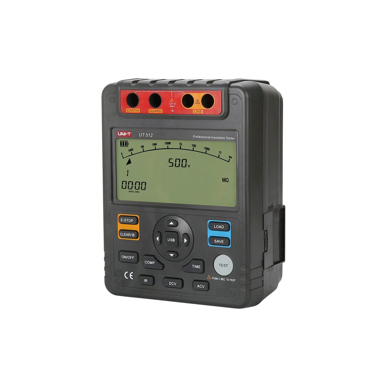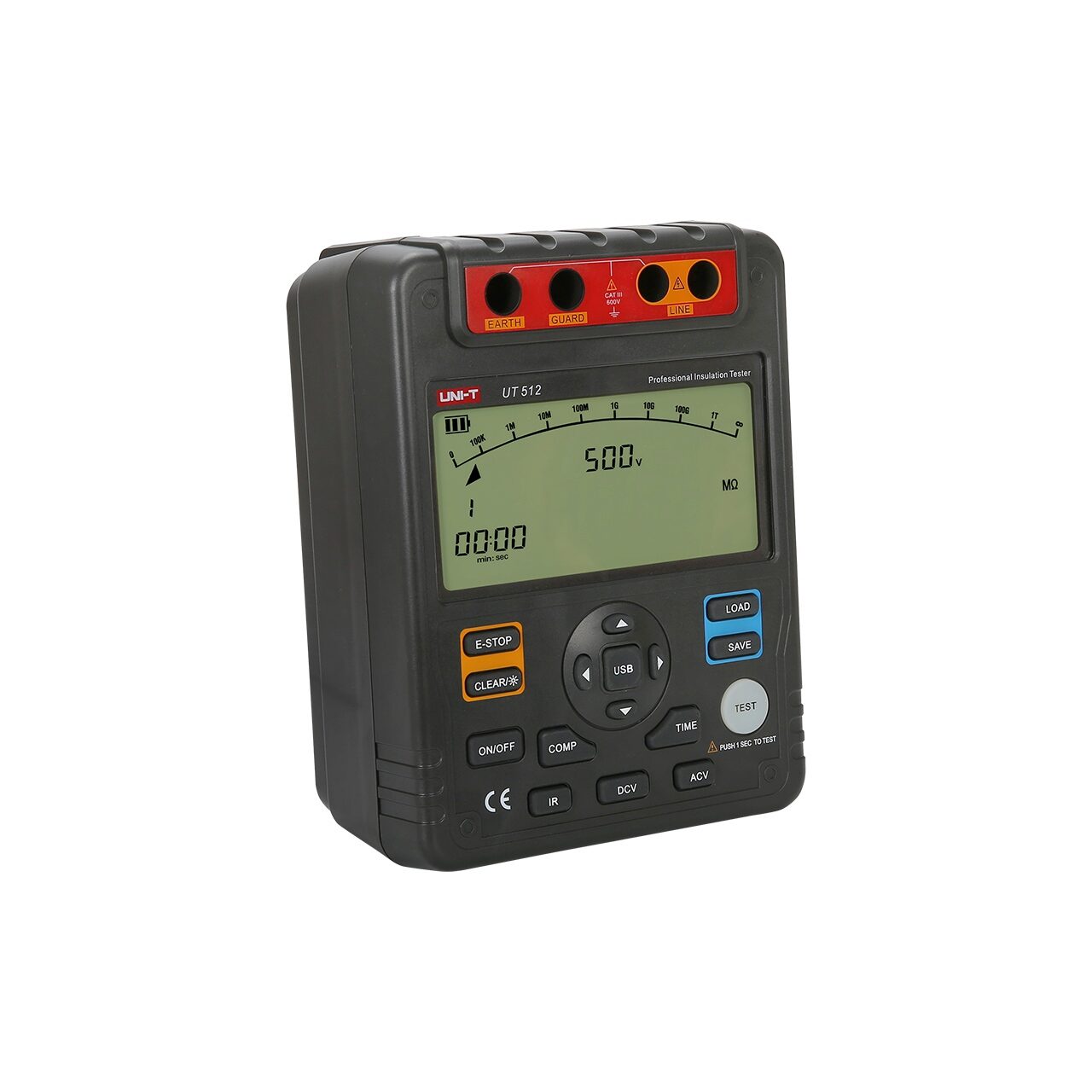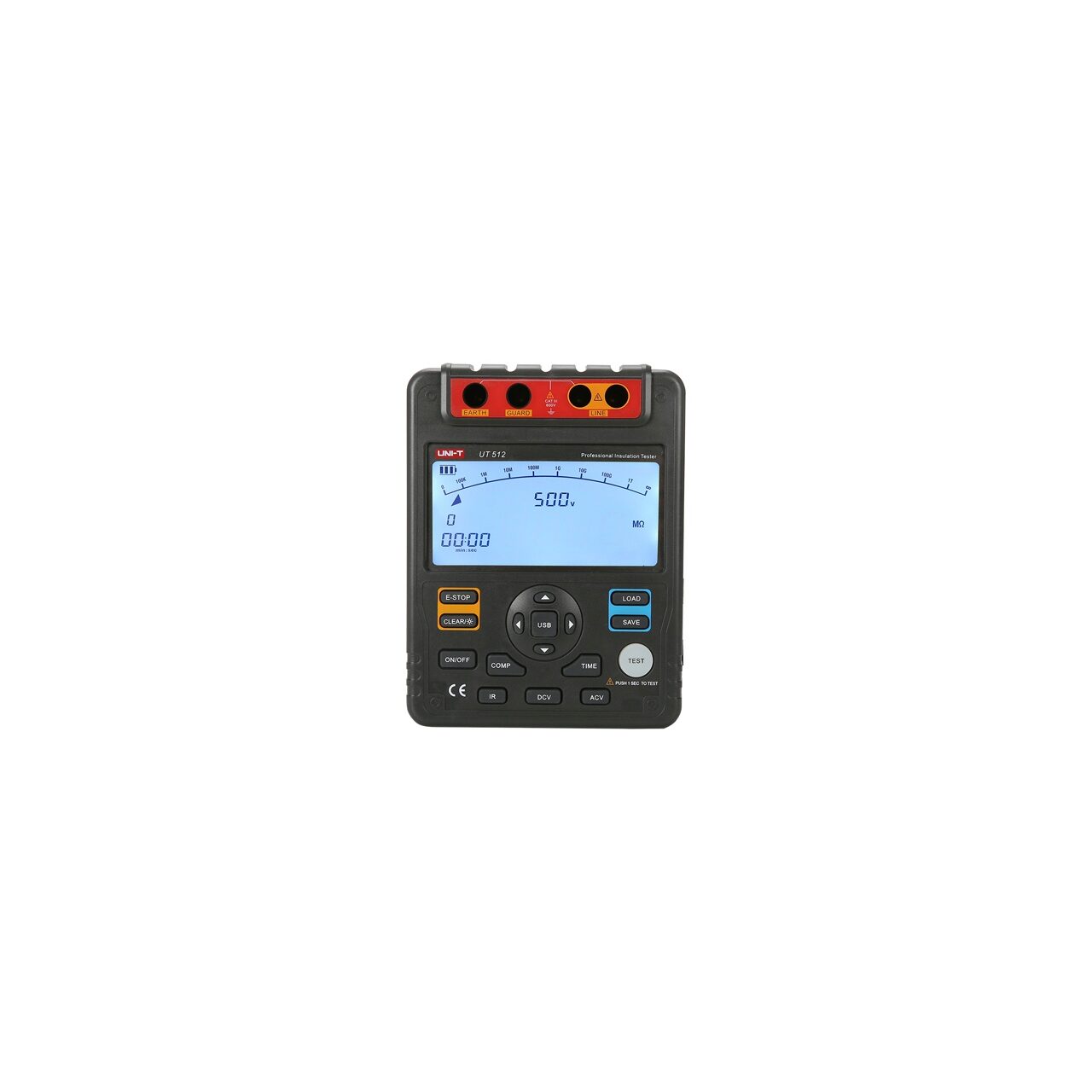 Multimetru pentru masurarea rezistentei de izolatie tip UT 512. Domeniul rezistentei de izolatie: 1 MOhm -10 GOhm Tensiunea de testare: 500V/1000V/1500V/2500V Tensiune DC: 600V Tensiune AC: 600V Temporizator: 15 min aprox. Afisare maxima: 9999 Alte caracteristici: Alimentare: 8 baterii 1.5V (R14) Dimensiune ecran LCD: 123 x 58 mm Greutate: 1.8 kg Dimensiuni: 202 x 155 x 94 mm