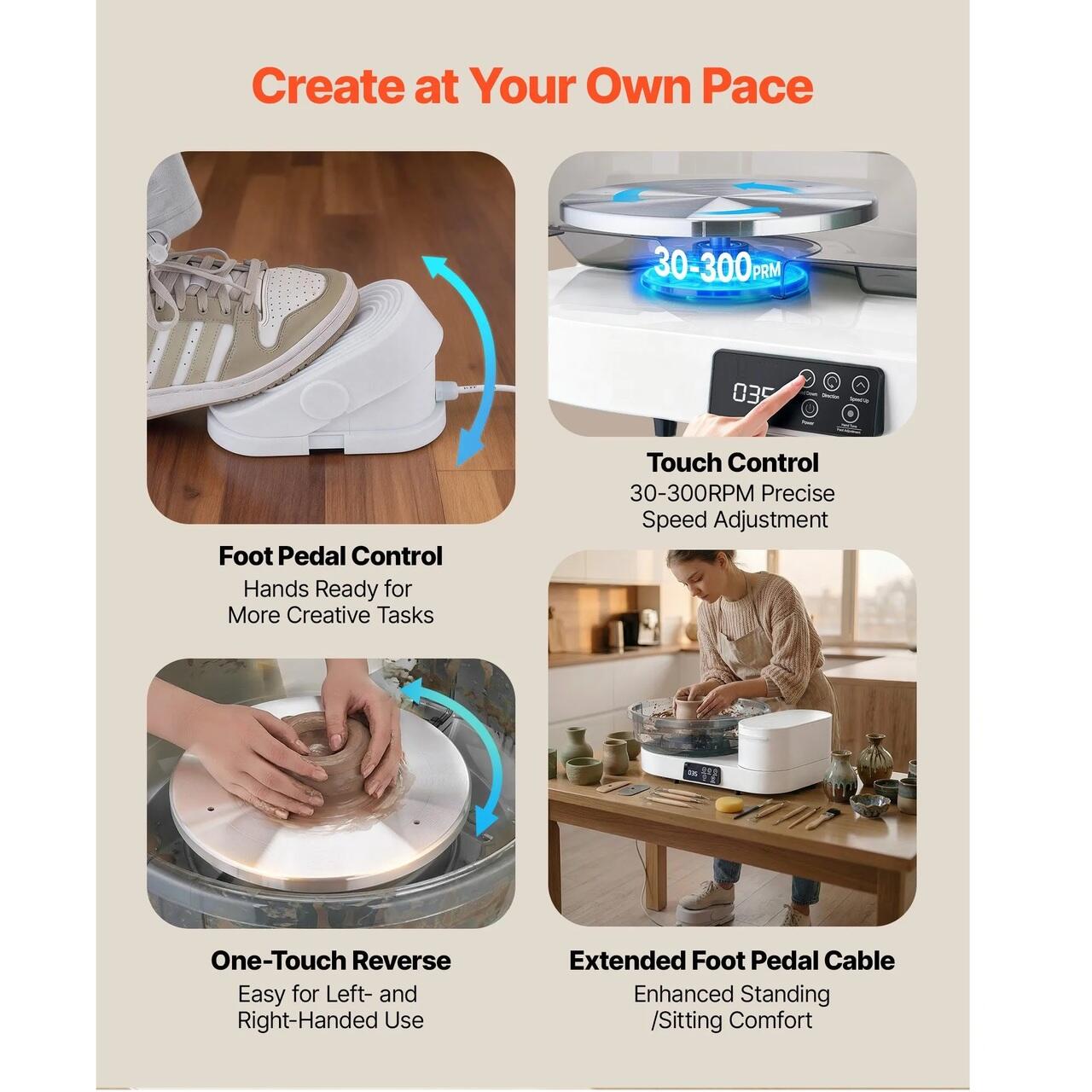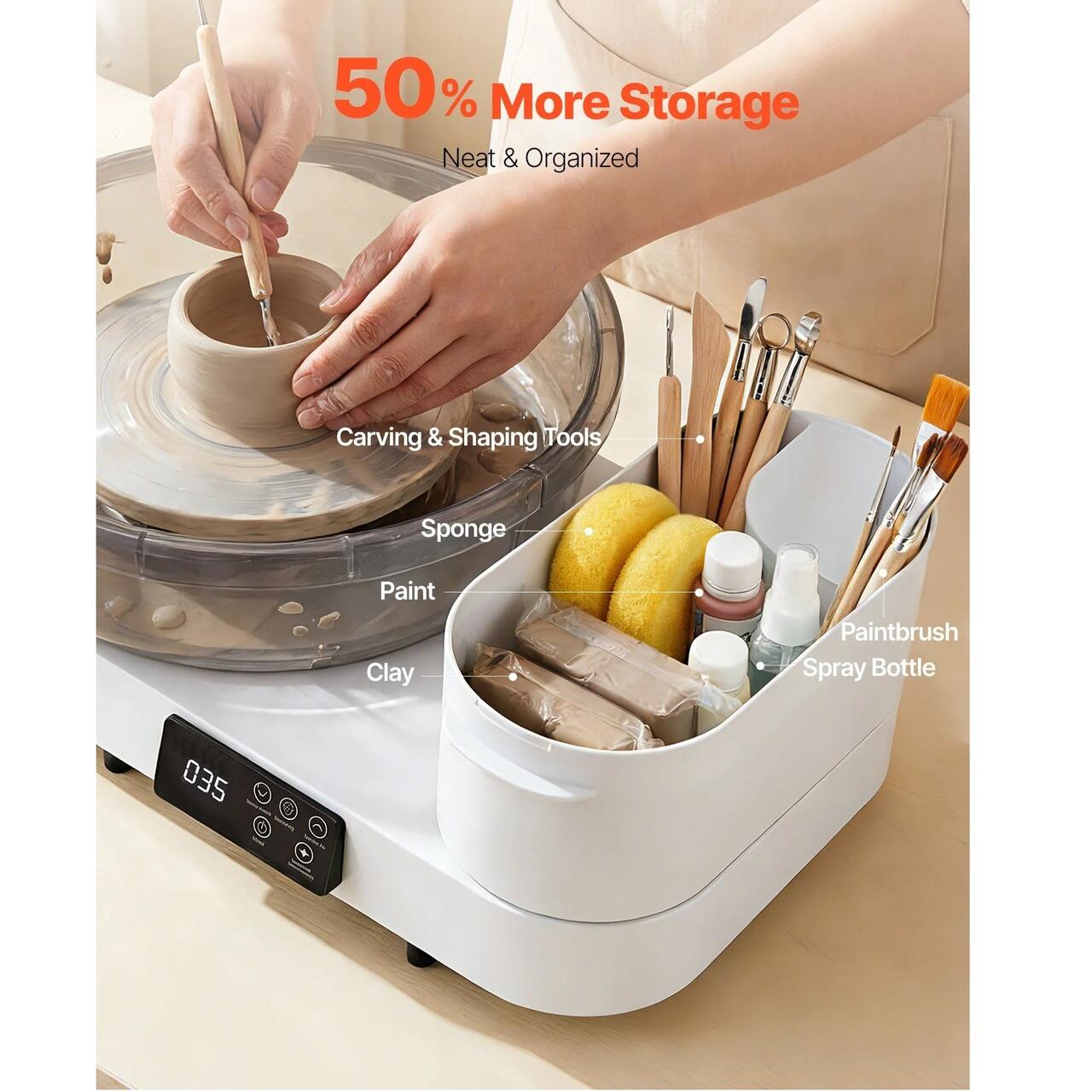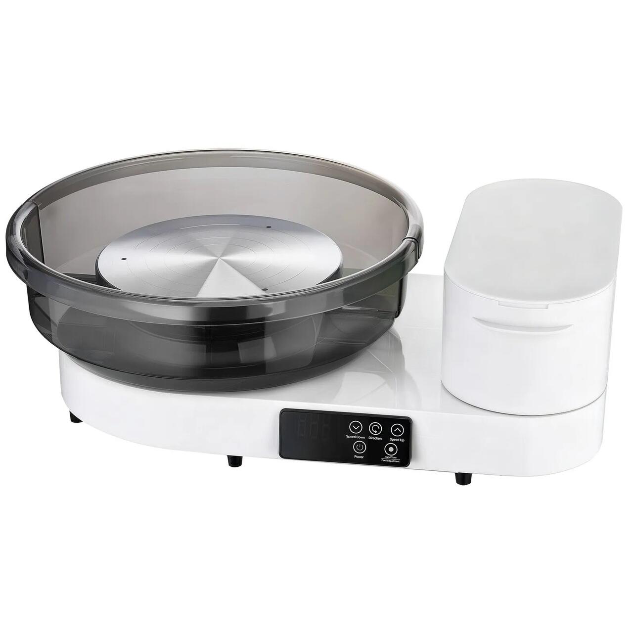 Depozitare integrata a uneltelor: Roata noastra electrica de olar va mentine concentrati asupra artei voastre. Cutia multifunctionala din partea dreapta pastreaza apa, uneltele de taiere si obiectele esentiale la indemana, reducand dezordinea pentru un flux de lucru creativ lin si neintrerupt.