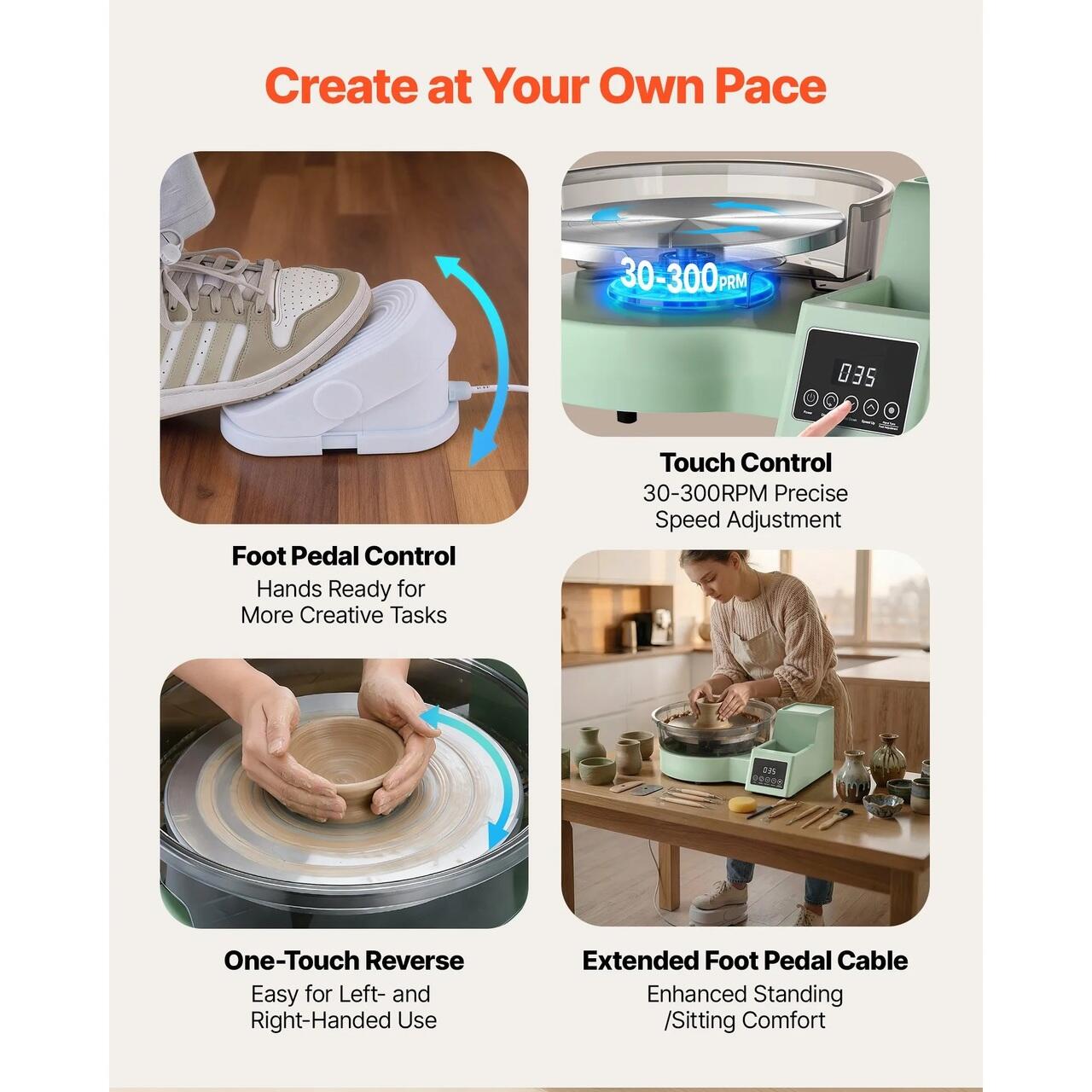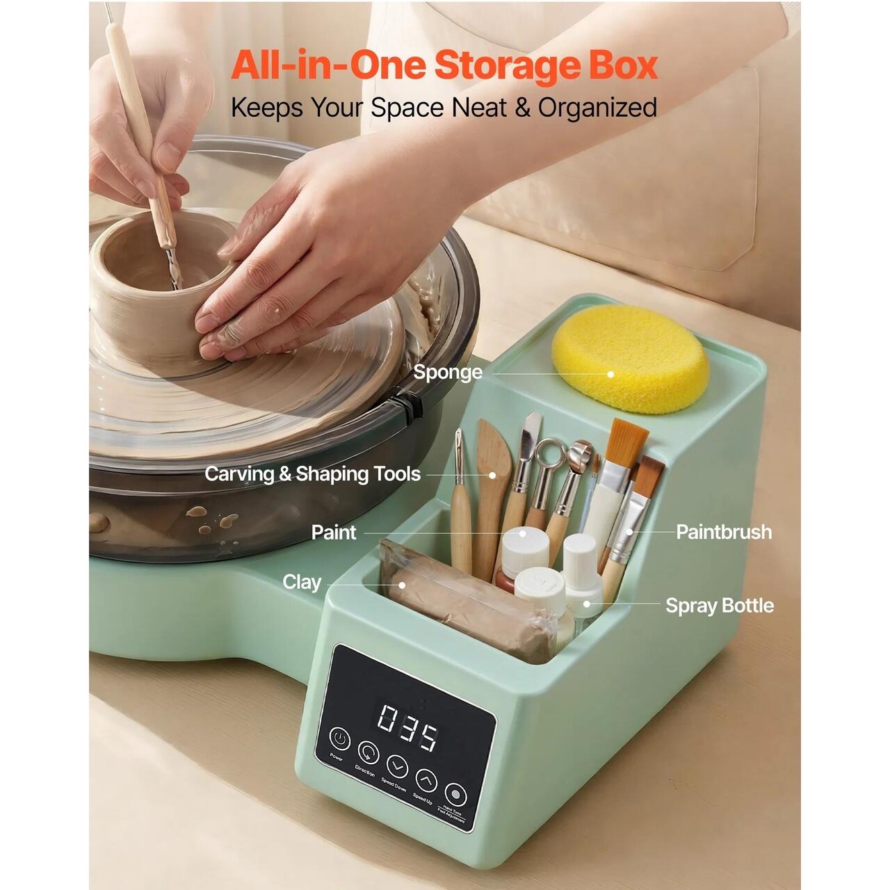 Depozitare integrata a uneltelor: Roata noastra electrica de olar va mentine concentrati asupra artei dumneavoastra. Cutia de depozitare cu doua straturi din partea dreapta tine uneltele de taiere, vopselele si alte obiecte esentiale la indemana, reducand dezordinea pentru un flux de lucru creativ lin si neintrerupt.