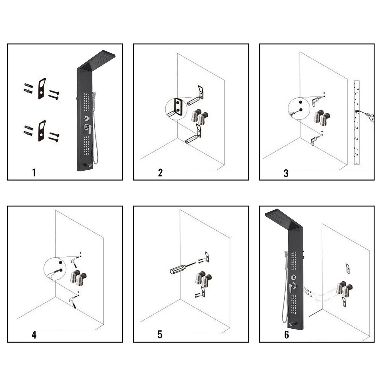 Design montat pe perete, toate accesoriile de asamblare sunt incluse in pachet. Cu conducte de apa calda/rece preinstalate, conducte ranforsate, conector standard pentru instalatii sanitare, port tub de 1/2 inch, acest sistem de dus multifunctional negru este rapid si usor de instalat de unul singur sau de un instalator.