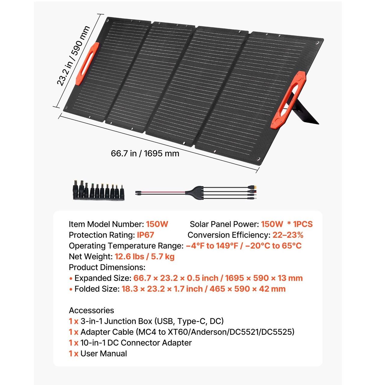 Panou solar camping, Pliabil, monocristalin, 150 W, IP67, Incarcator multi-dispozitiv, 1695 x 590 x 13 mm