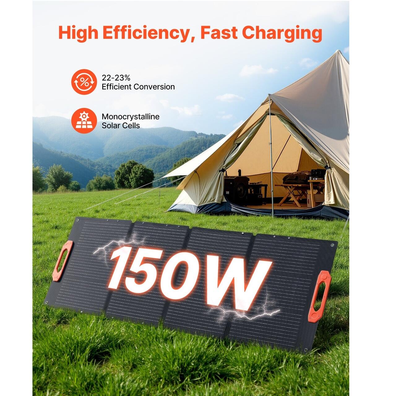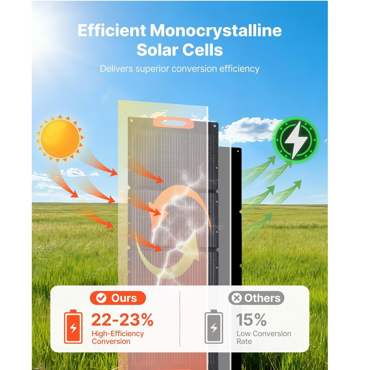 Eficienta superioara: Avand o pelicula ETFE cu transmitanta ridicata si monocelule premium cu o eficienta de conversie de 22-23%, acest panou solar pliabil de 150 W transforma mai multa lumina solara in energie utilizabila, asigurand o generare eficienta de energie pentru incarcarea rapida a dispozitivelor.