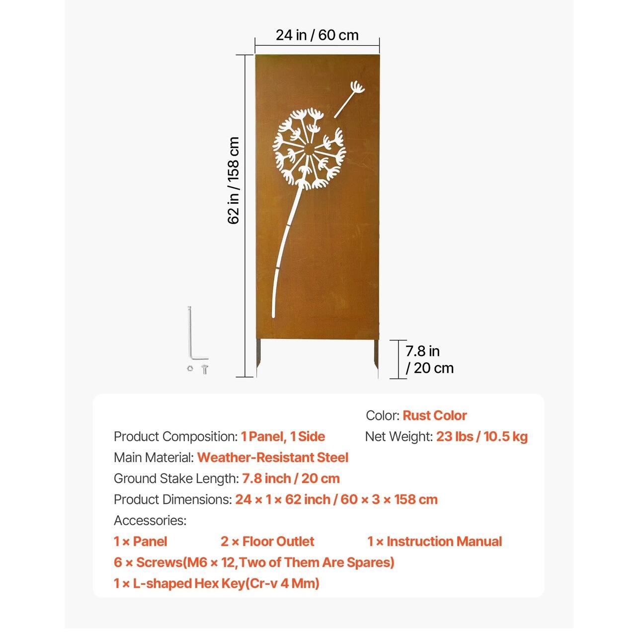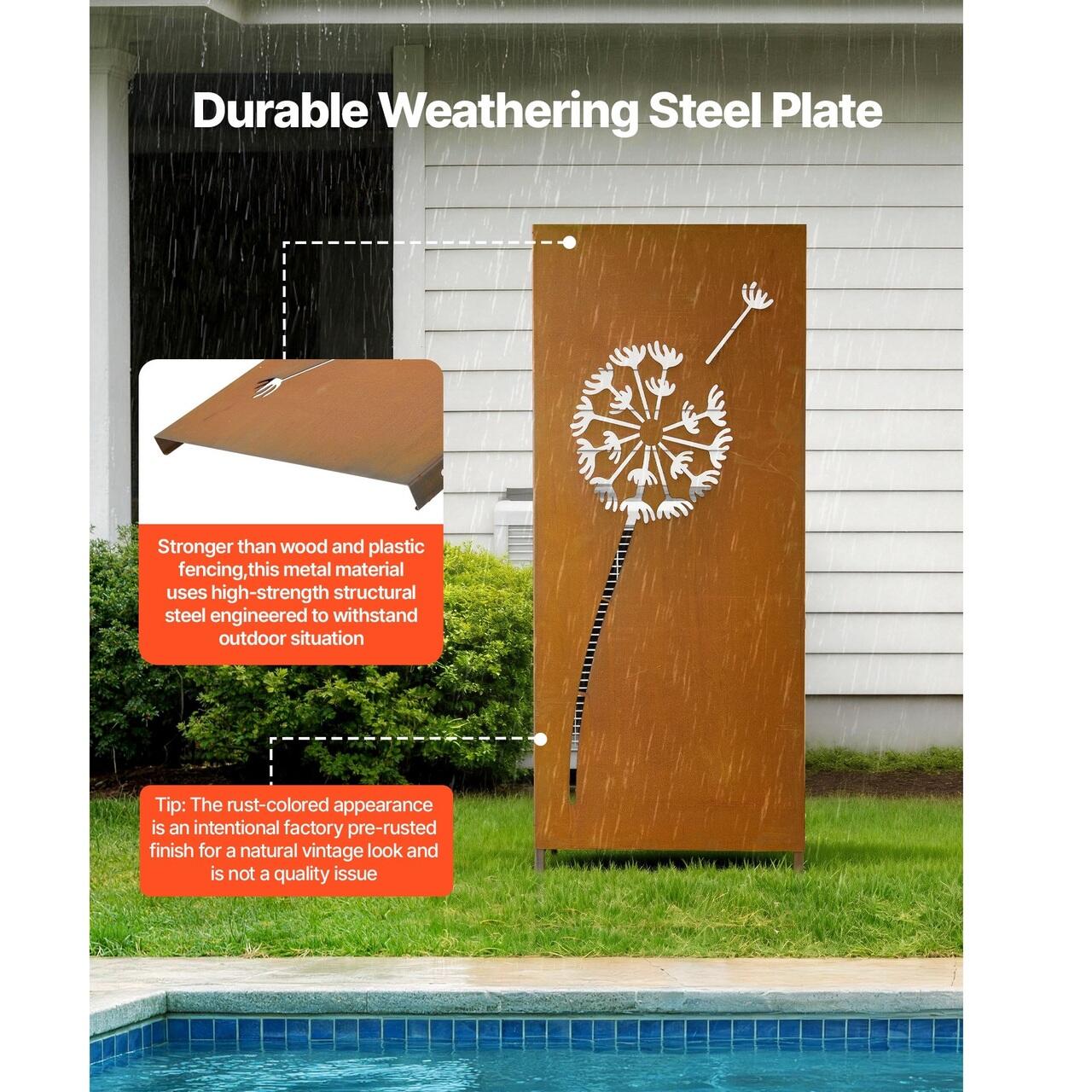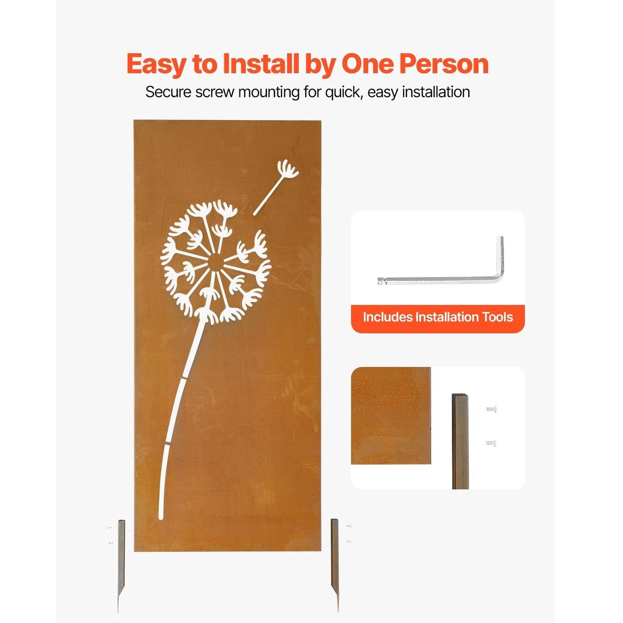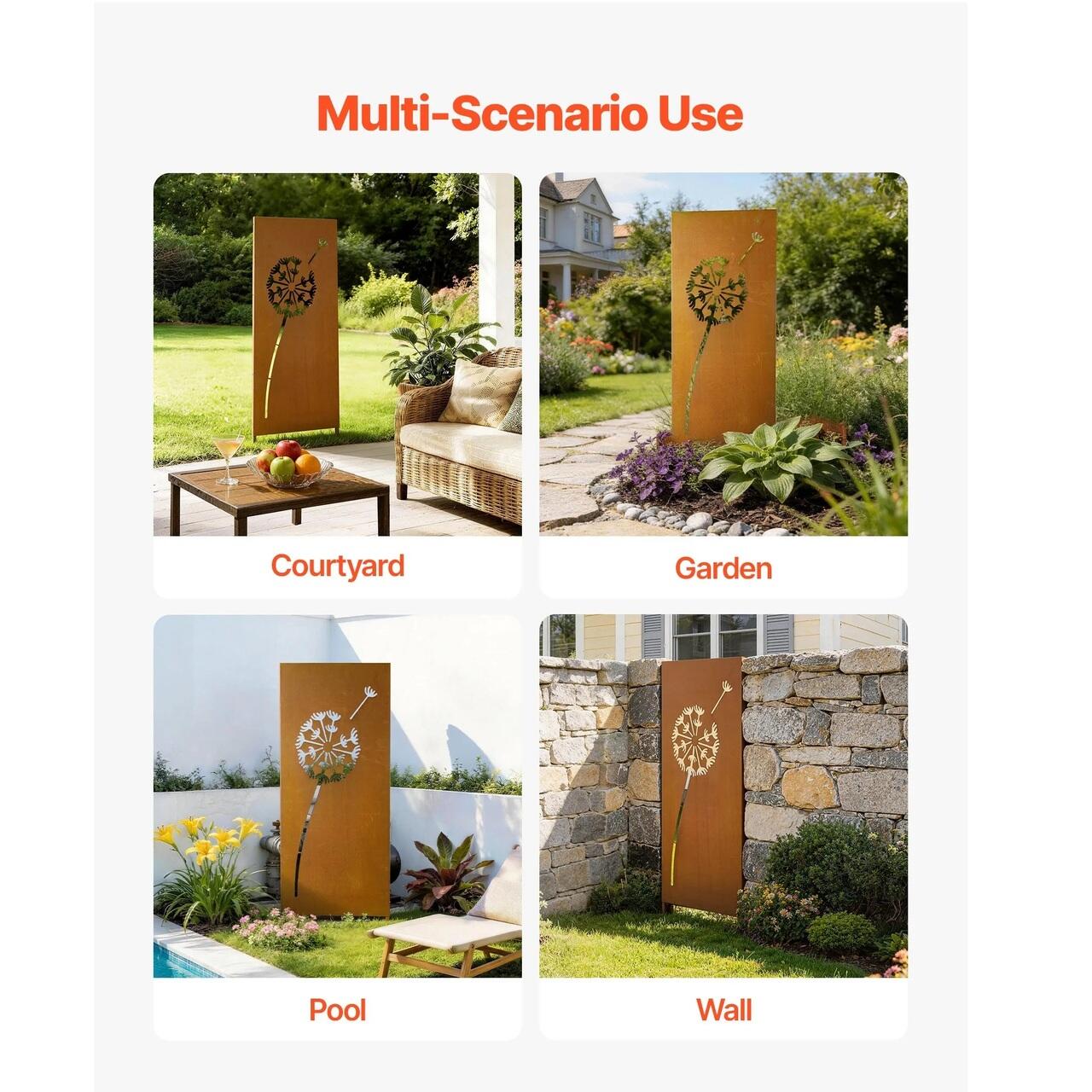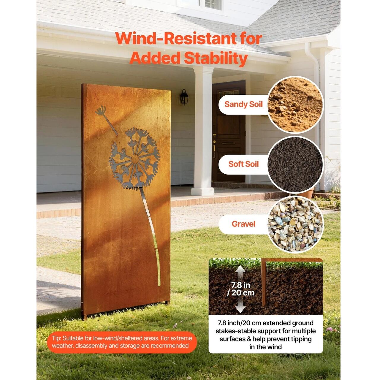 Suport ferm pentru sol: Avand tarusi de sol extinsi de 20 cm, acest paravan decorativ independent poate fi plasat in siguranta in nisip, sol afanat sau pietris. Introducerea mai adanca sustine o configuratie bine ancorata, ajutand panoul sa ramana stabil si aliniat vizual in mediile exterioare.
