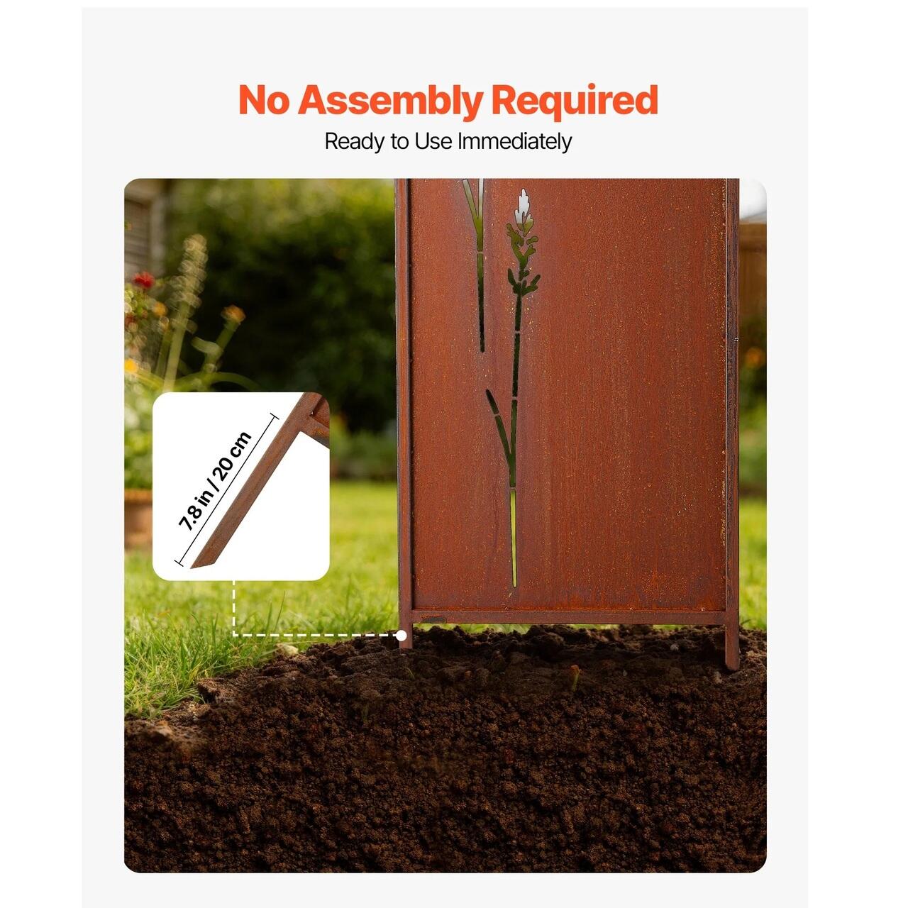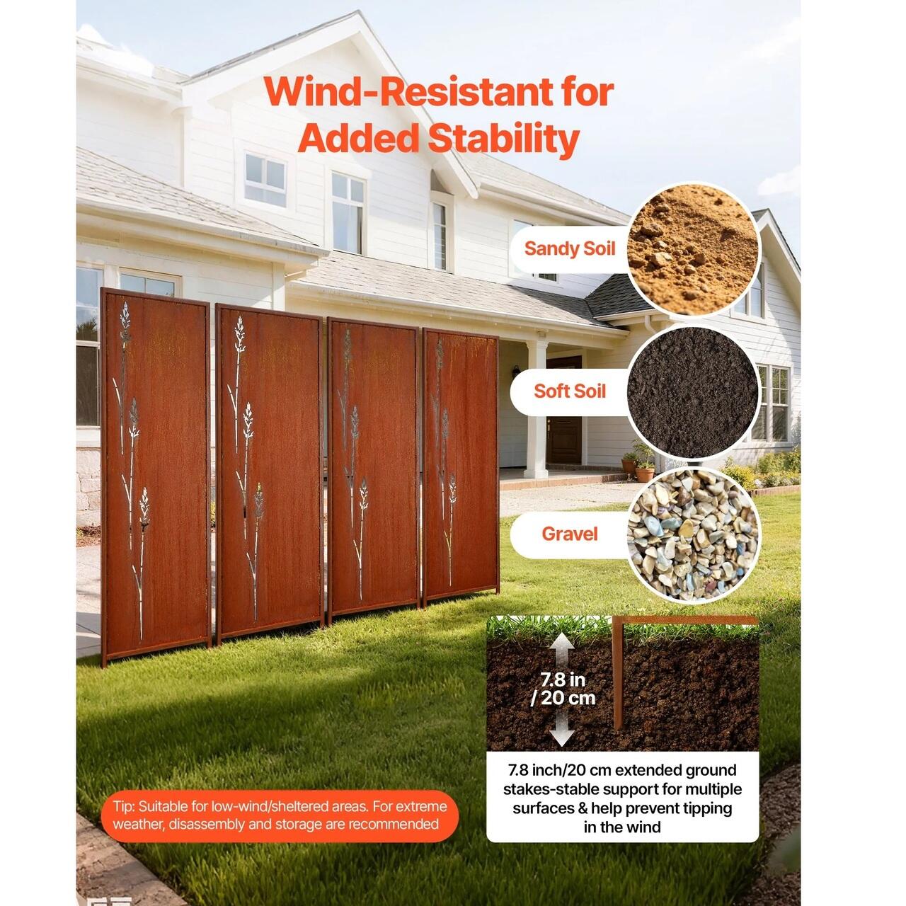 Suport ferm pentru sol: Avand tarusi de sol extinsi de 20 cm, acest paravan decorativ independent poate fi plasat in siguranta in nisip, sol afanat sau pietris. Introducerea mai adanca sustine o configuratie bine ancorata, ajutand panoul sa ramana stabil si aliniat vizual in mediile exterioare.