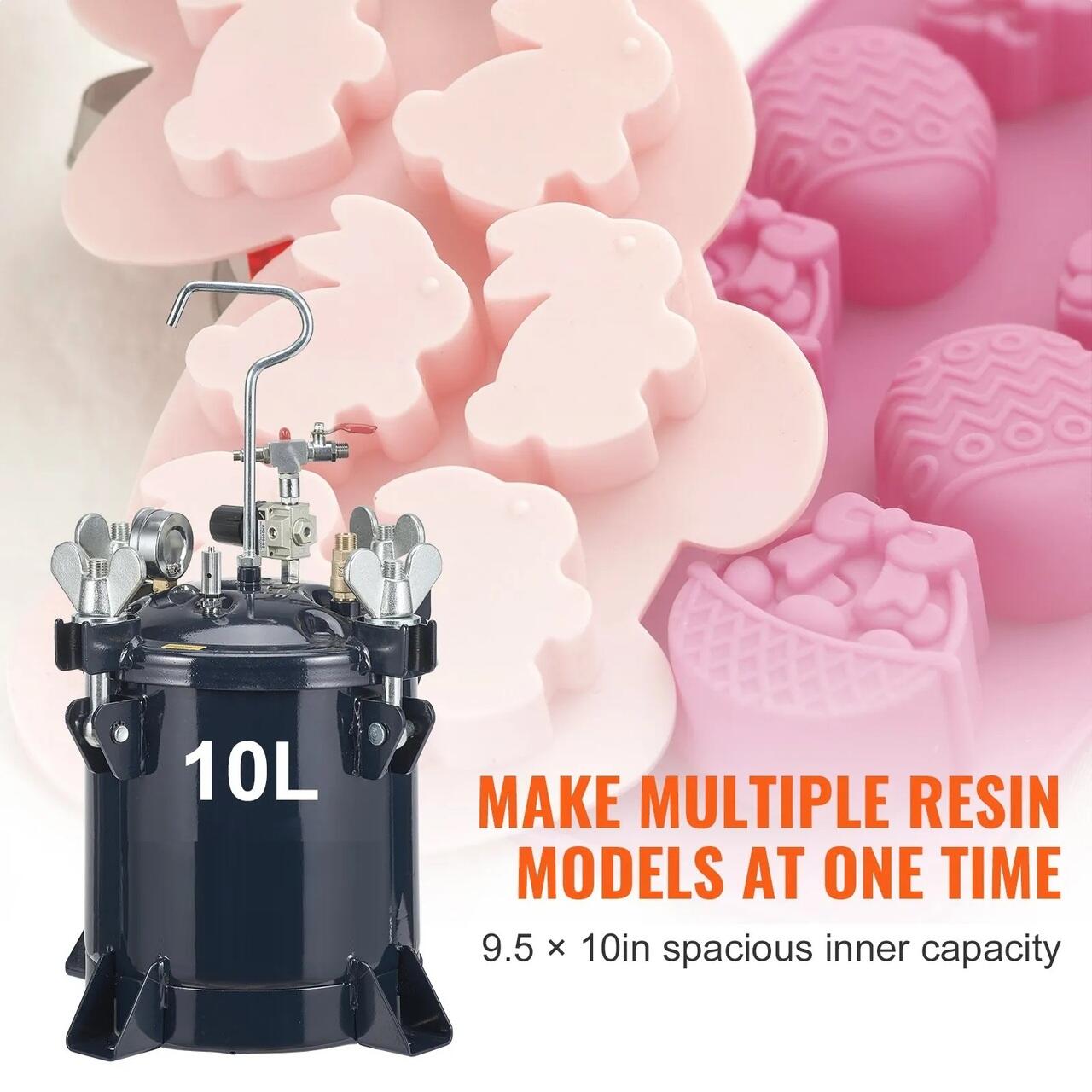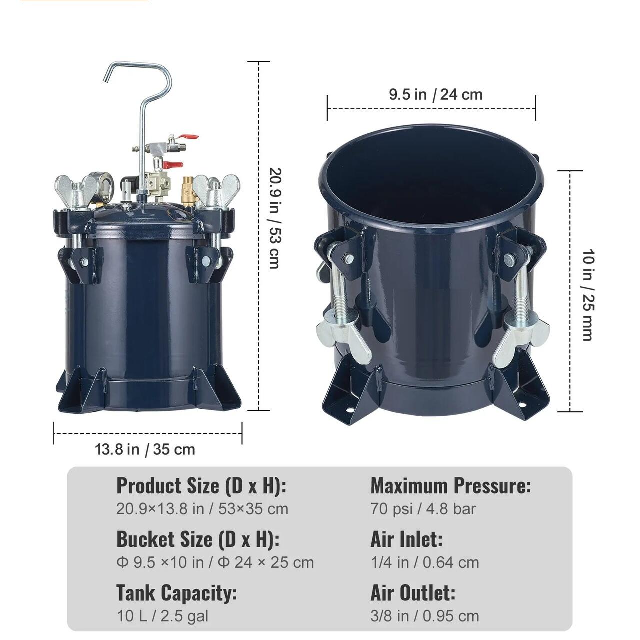 Capacitate mare de 10 litri: Va prezentam rezervorul nostru de ultima generatie de 10 litri pentru vopsea pulverizata, cu un orificiu de intrare si iesire de 1/4" si un orificiu de evacuare a fluidului de 3/8". Acest lucru faciliteaza conectarea la un pistol de pulverizare pentru o pulverizare mai eficienta si fara efort pe diferite suprafete. Acest vas sub presiune de turnare cu rasina este perfect pentru cei care doresc sa realizeze mestesuguri din rasina de inalta calitate sau sa efectueze sarcini de vopsire prin pulverizare.