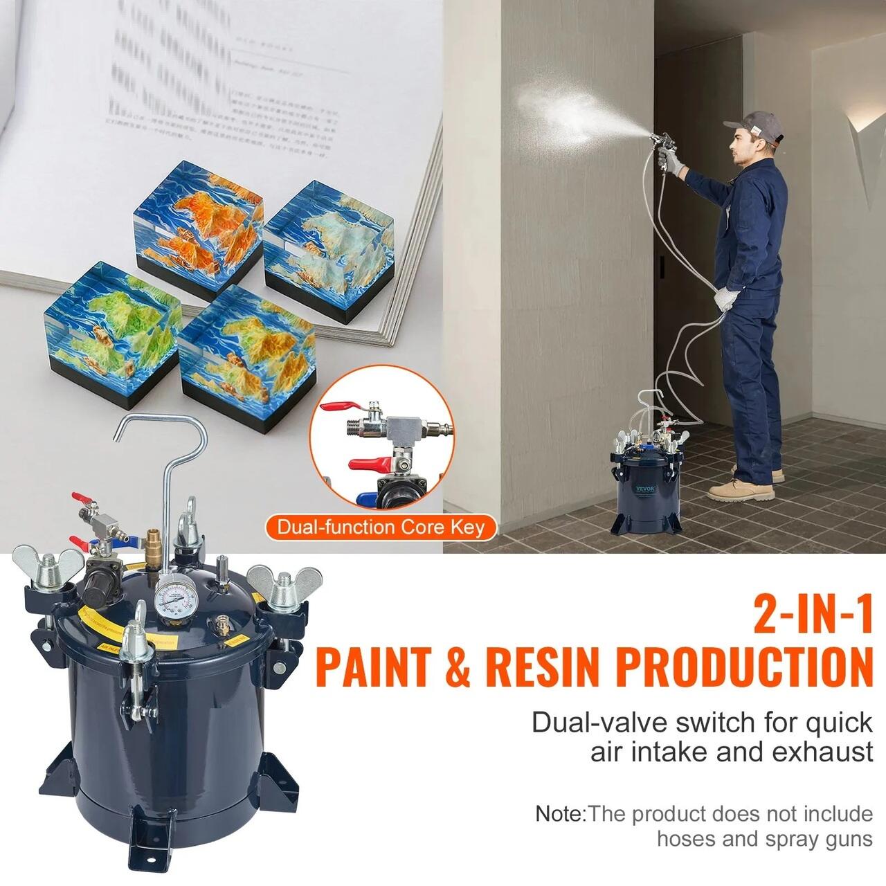 Aplicat pentru produse din rasina: oala de presiune ideala pentru vopsea pentru fabricarea rasinii, care poate fi folosit si pentru vopsirea prin pulverizare. Rezervorul de oala sub presiune are un design cu dubla supapa care va permite sa inchideti supapa de evacuare si sa conectati compresorul de aer la portul de admisie a aerului pentru presurizare, rezultand mai putine bule si rasini perfecte.