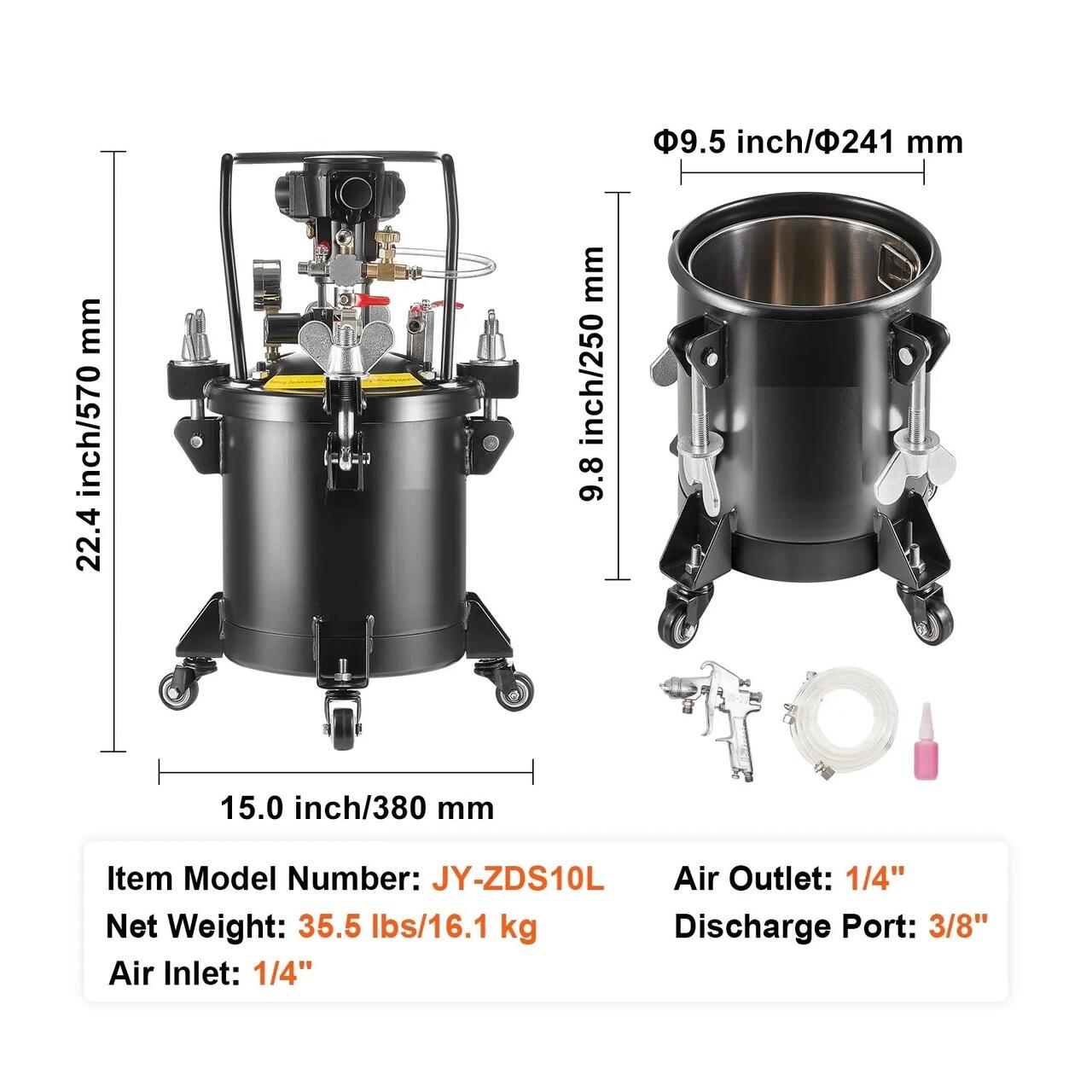 Capacitate mare de 10 l: Rezervorul de vopsea spray sub presiune are o capacitate de 10 l, cu diametre de intrare si iesire de 1/4" si un diametru de iesire a fluidului de 3/8". Aceasta capacitate extra-mare va permite sa finalizati eficient sarcinile de vopsire pentru exteriorul cladirilor, garduri exterioare, barci, decoratiuni interioare si multe altele, fara a fi nevoie de reumpleri frecvente de vopsea.
