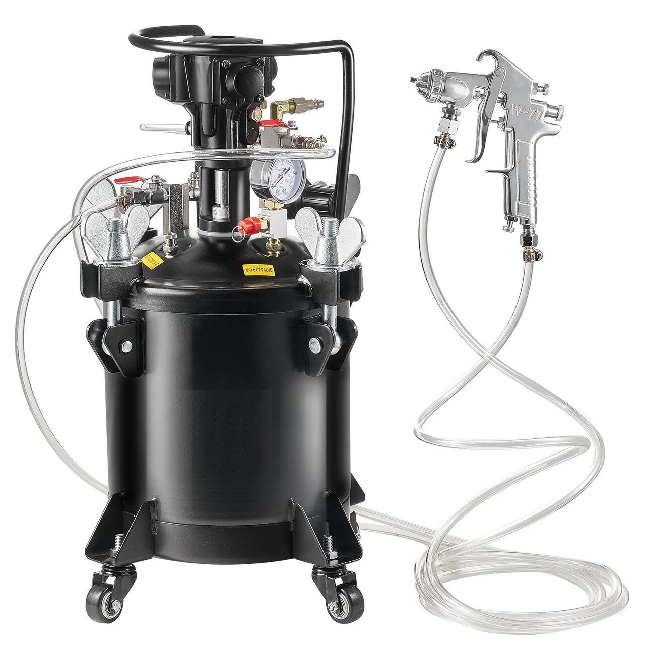 Pulverizare uniforma cu pistolul de vopsit: Recipientul sub presiune este dotat cu un pistol de vopsit de 1,5 mm, compatibil cu majoritatea vopselelor, inclusiv latex, lac, metalizat si multicolor. In plus, veti primi doua furtunuri de 3 m si patru roti, ceea ce faciliteaza mutarea recipientului in diverse locatii de lucru.