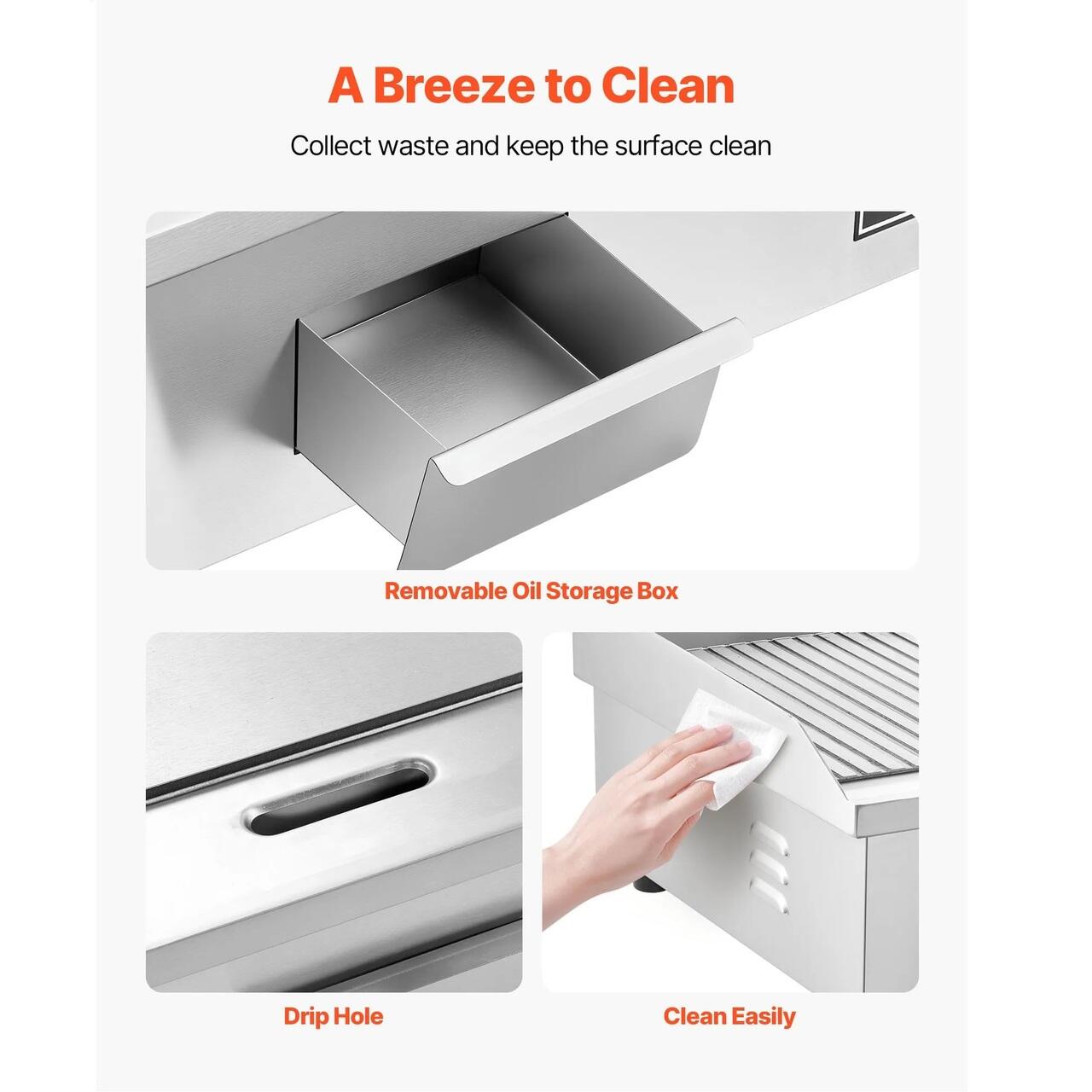 Usor de curatat: Orificiul de scurgere marit si tava de ulei detasabila colecteaza deseurile pentru o curatare rapida. Gratarul nostru comercial cu blat semi-plat include perii si spatule pentru un confort sporit.