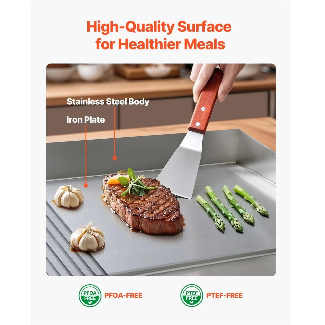 Mananca in voie: Corpul din otel inoxidabil de inalta calitate al plitei comerciale si suprafata de gatit din fier, fara PFOA/PTFE, ofera durabilitate de lunga durata si o experienta culinara mai sanatoasa.