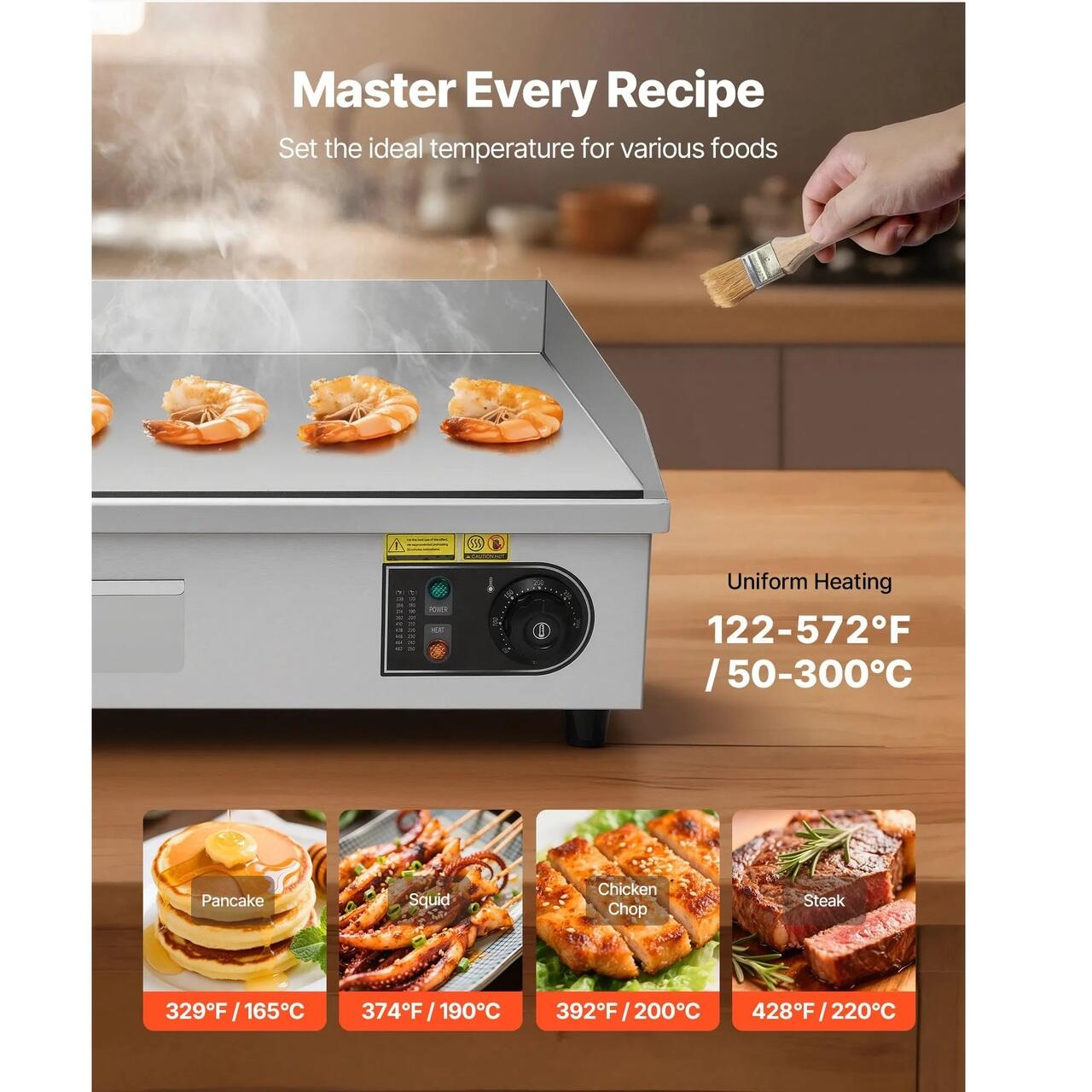 Control precis al incalzirii: Temperatura reglabila de la 50°C la 300°C, aceasta plita electrica din otel inoxidabil va permite sa obtineti caldura ideala pentru clatite, fripturi, pui si multe altele