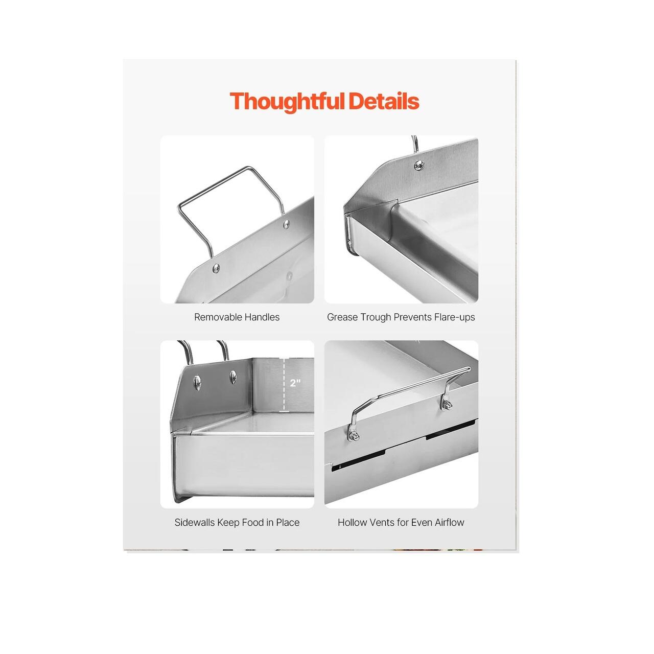 Detalii atent gandite: Plita are manere detasabile pentru depozitare usoara, un jgheab pentru grasime pentru a preveni aprinderea grasimilor, pereti laterali pentru a mentine alimentele la locul lor si orificii de ventilatie goale pentru un flux de aer uniform, asigurand o experienta de gatit mai sigura, mai curata si mai eficienta.