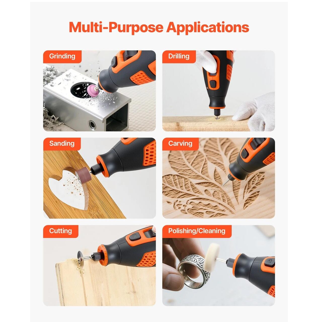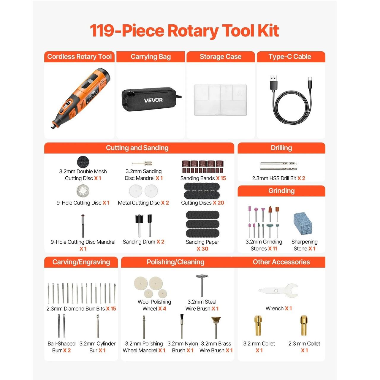 Trusa de scule rotative cu 119 piese: Un set complet de accesorii pentru taiere, slefuire, gaurire, slefuire, sculptura, gravare, lustruire si curatare - perfecta pentru reparatiile zilnice la domiciliu si proiectele creative. Cutia de depozitare a accesoriilor si geanta de transport incluse ofera o depozitare ordonata si o portabilitate usoara.