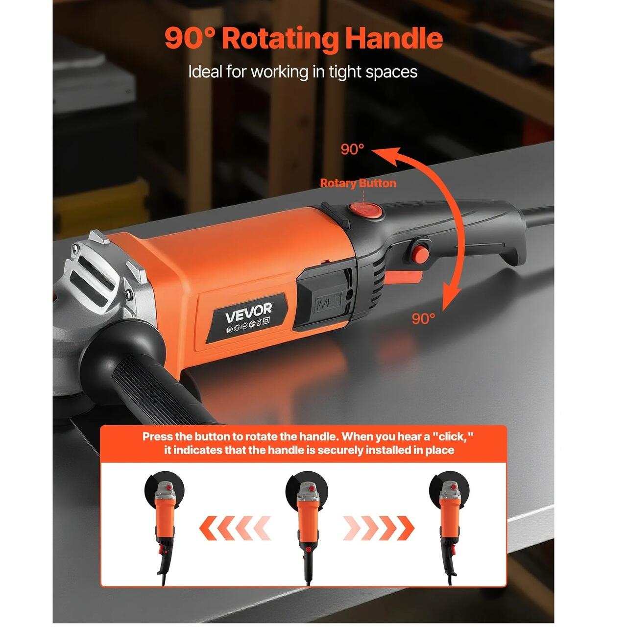 Design ergonomic: Cu dimensiuni compacte si corp usor, acest polizor unghiular portabil ofera o prindere confortabila din cauciuc care reduce oboseala utilizatorului in timpul utilizarii prelungite. Iar manerul rotativ la 90° il face ideal pentru spatii inguste.