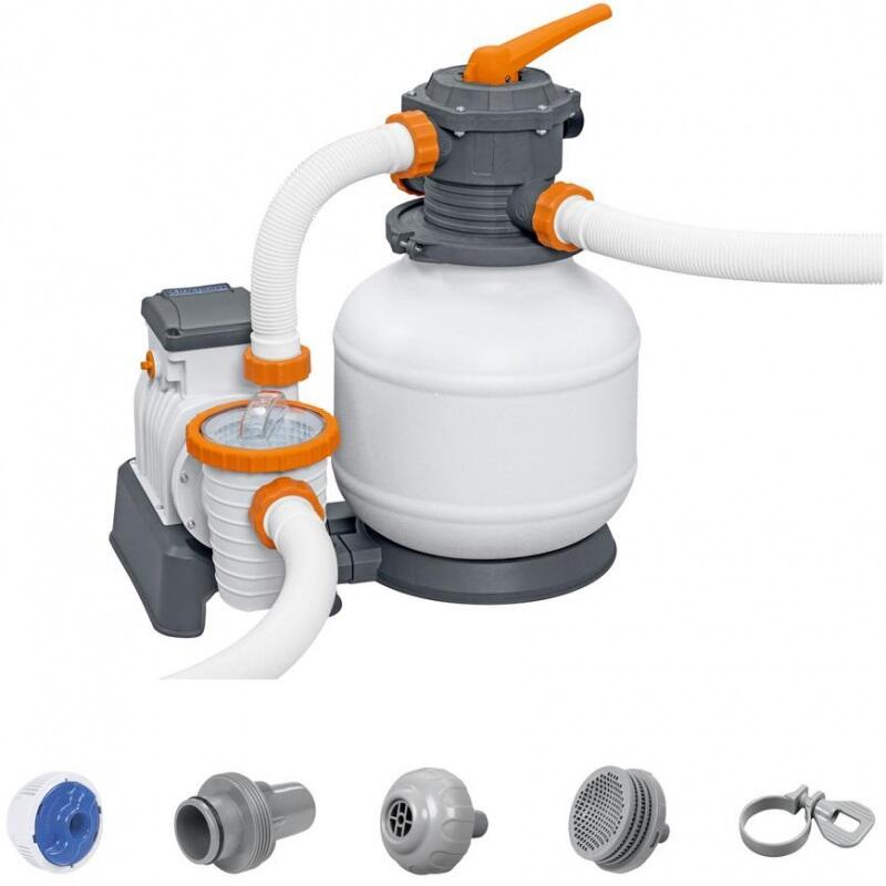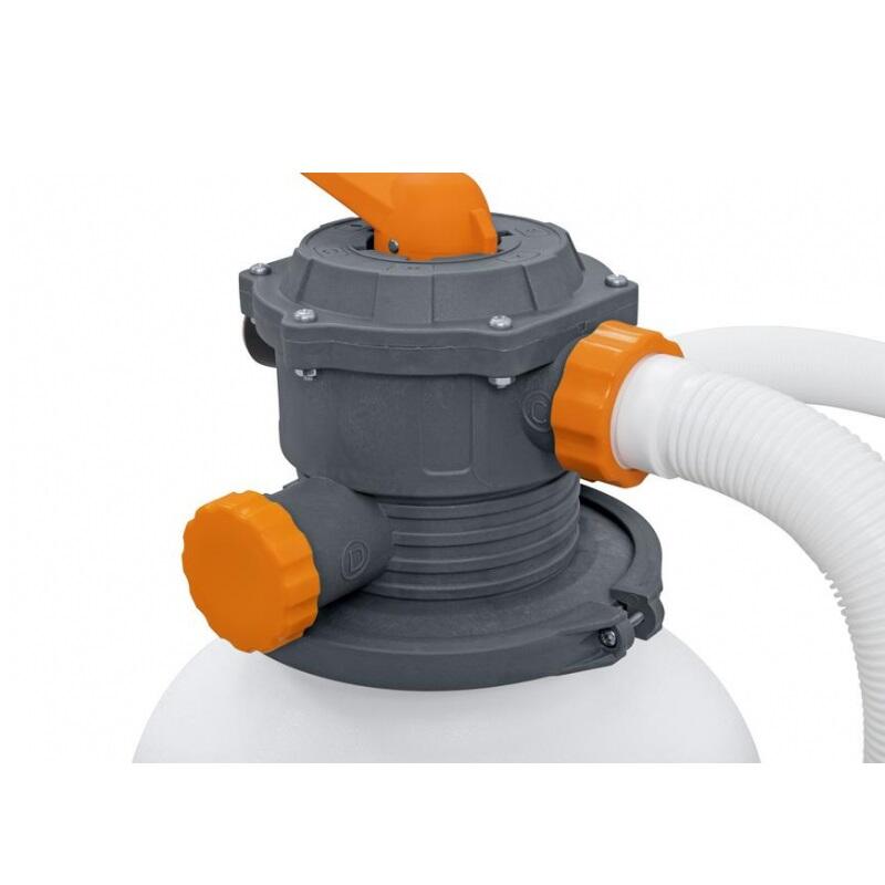 Filtrul de nisip Flowclear™ 8327 L de la Bestway® este o modalitate extrem de eficienta si ecologica de a mentine apa din piscina curata. Aceasta solutie eficienta din punct de vedere al costurilor foloseste o pompa care foloseste nisip de siliciu in locul unui cartus filtrant traditional. Desi aceste cartuse trebuie inlocuite la fiecare 2 saptamani, nisipul de siliciu dureaza pana la 3 ani. Nisipul prinde murdaria si resturile, iar cosul prefiltru prinde lucrurile mai mari, astfel incat pompa sa tina mai mult.