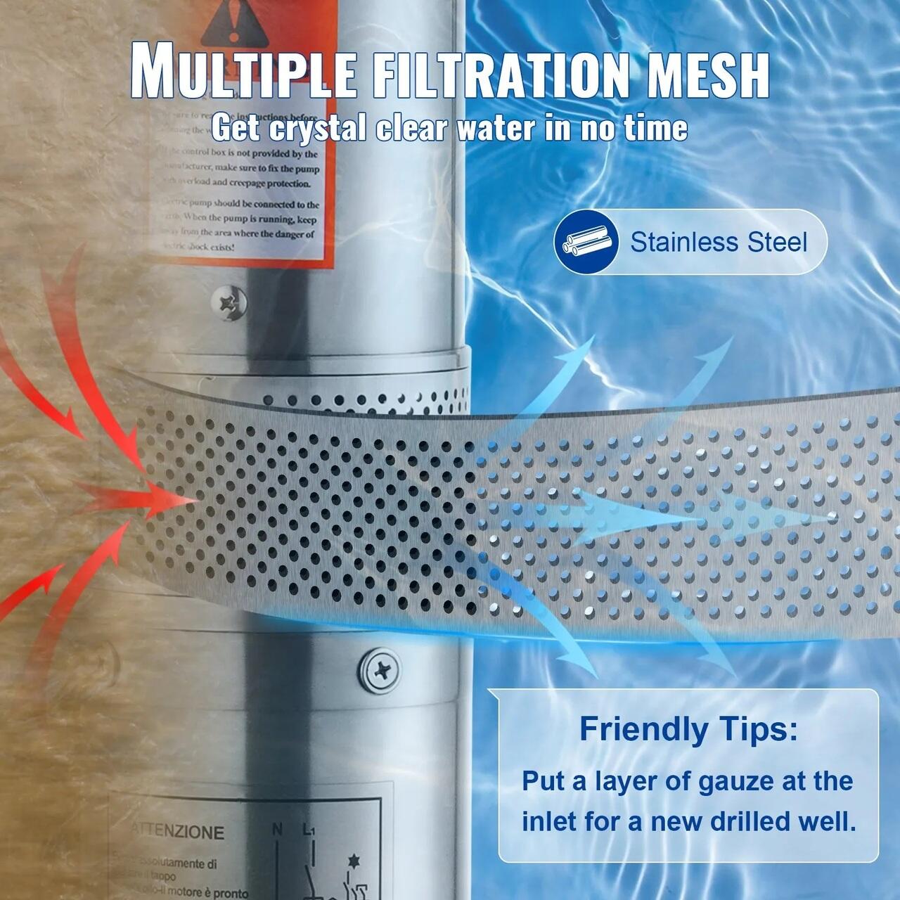 Supapa de sens unidirectional si filtru fara probleme: Aceasta pompa de put are o supapa de sens unidirectional incorporata pentru a preveni refluxul (o supapa de sens unidirectional suplimentara este foarte recomandata). Plasa de filtrare din otel inoxidabil este conceputa pentru a filtra impuritatile. Puteti adauga un strat de tifon in fata orificiului de filtrare pentru un put nou forat care poate contine sedimente granulare excesive. Tineti impuritatile la distanta fara batai de cap.