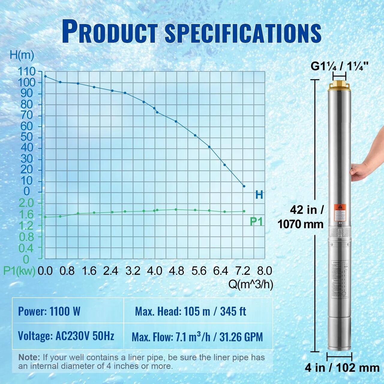 Debit si inaltime de pompare imbunatatite: Putere: 1100W, 230V; Refulare: G1¼ (Diametrul carcasei putului trebuie sa fie cu 10 mm mai mare decat diametrul pompei). Aceasta pompa submersibila pentru puturi adanci este proiectata cu rotoare termoplastice in 14 trepte, oferind un debit maxim de 7,1 m³/h si o inaltime de pompare maxima de 105 m. Vine cu un cablu electric de 19,4 m, ceea ce face viata fara instalatii sanitare moderne mult mai usoara. Scapati-va de griji cu usurinta si relaxati-va. Nicio provocare nu este prea mare pentru dumneavoastra.