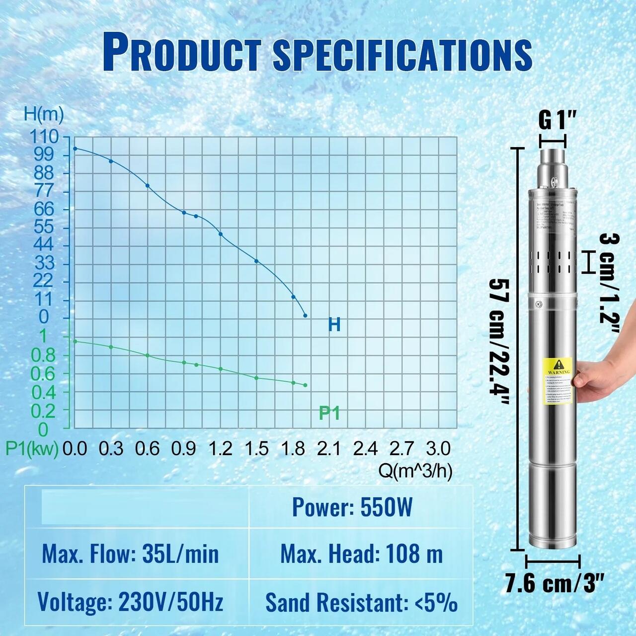 Debit si inaltime de pompare imbunatatite: Putere: 550W, 230V; Rezistenta la nisip: <5%; Diametru: 7,6 cm (pentru tubaj de put de 7,6 cm sau mai mare); Debit: 2,5 cm NPT. Aceasta pompa submersibila pentru puturi adanci este proiectata cu rotoare termoplastice, oferind un debit maxim de 35L/min si o inaltime de pompare maxima de 108 m. Vine cu un cablu electric de 20 m, ceea ce face viata fara instalatii sanitare moderne mult mai usoara. Eliminati-va grijile cu usurinta si relaxati-va. Nicio provocare nu este prea mare pentru dumneavoastra.