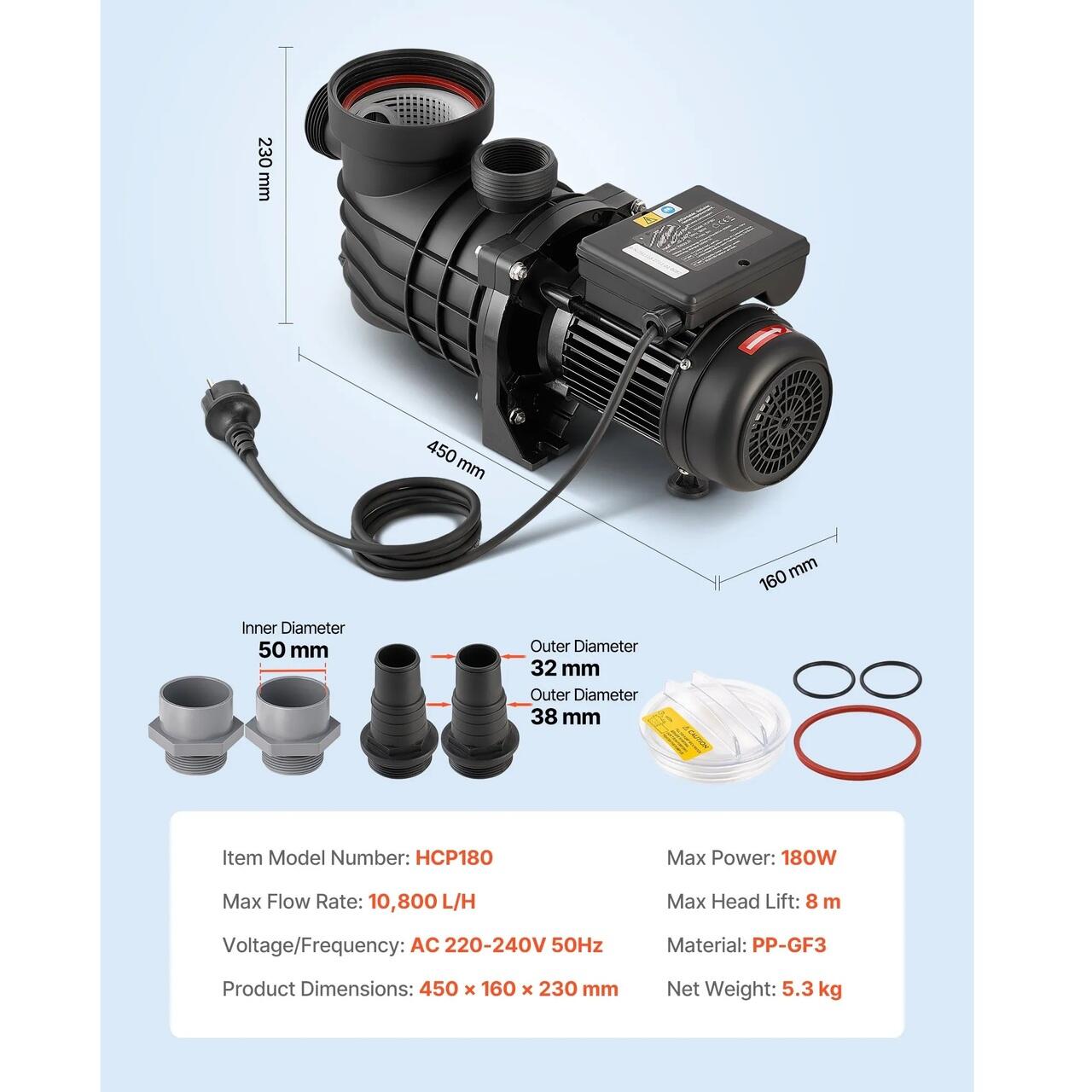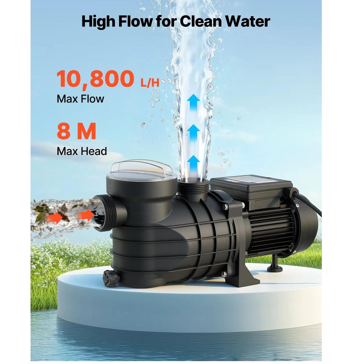 Pompa de piscina puternica de 180 W: Aceasta pompa de piscina este dotata cu un motor din cupru pentru o functionare stabila, de inalta performanta si silentioasa. Cu un debit maxim de 10.800 L/h si o inaltime maxima de 8 m, ofera o circulatie eficienta a apei pentru o experienta de inot curata.