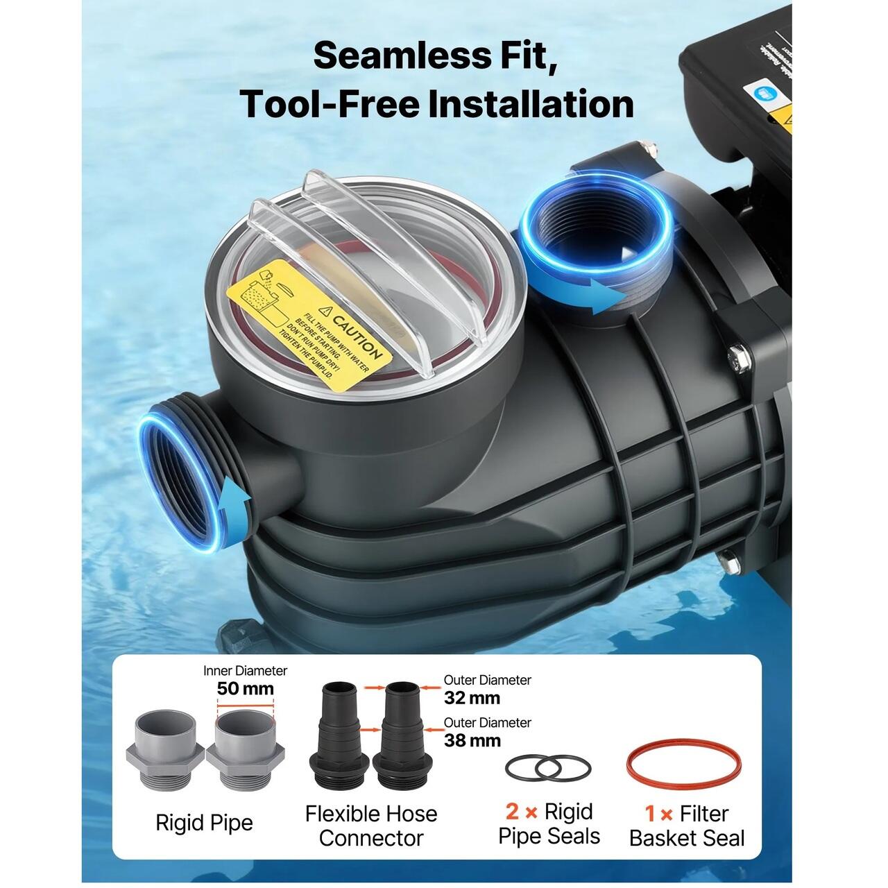 Instalare fara probleme: Aceasta pompa de piscina dispune de orificii standard cu conexiuni prin rasucire pentru o instalare rapida si fara unelte. Vine cu conectori pentru tevi si inele de etansare pentru conexiuni rezistente la scurgeri, sigure si o circulatie eficienta.