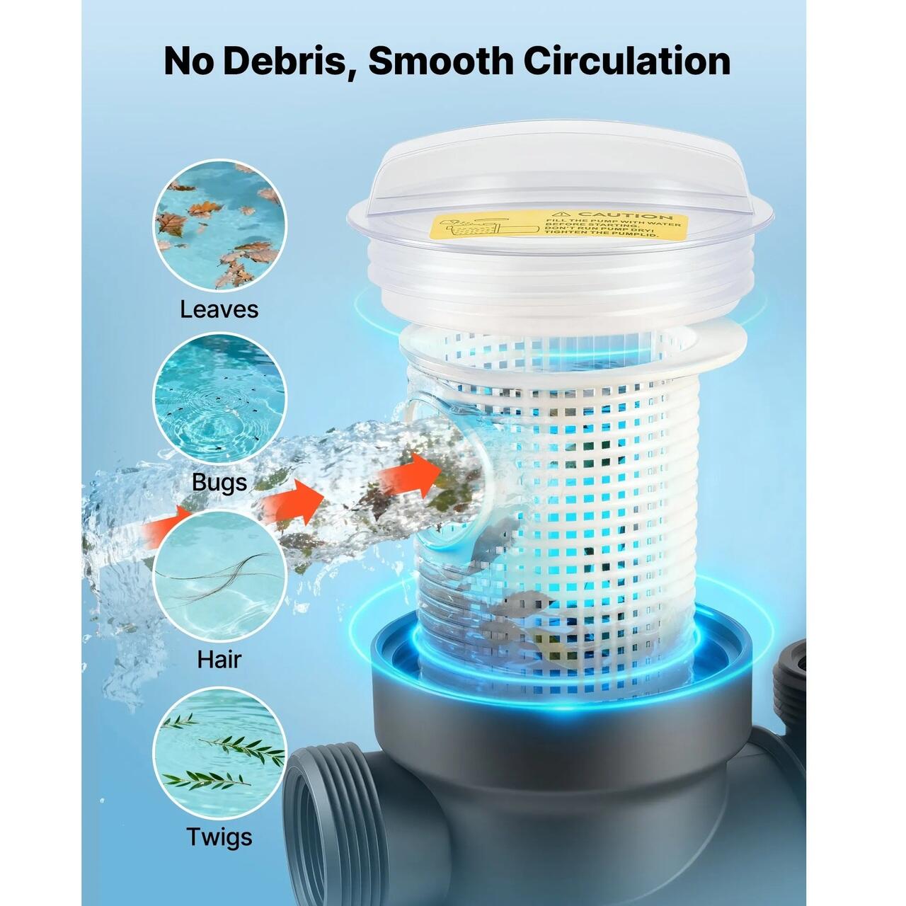 Cos de filtrare si capac incluse: Proiectata cu un cos de filtrare mare, aceasta pompa de piscina ajuta la captarea resturilor si la prelungirea intervalelor de curatare. Capacul transparent permite verificari vizuale rapide ale starii filtrarii pentru o intretinere usoara.