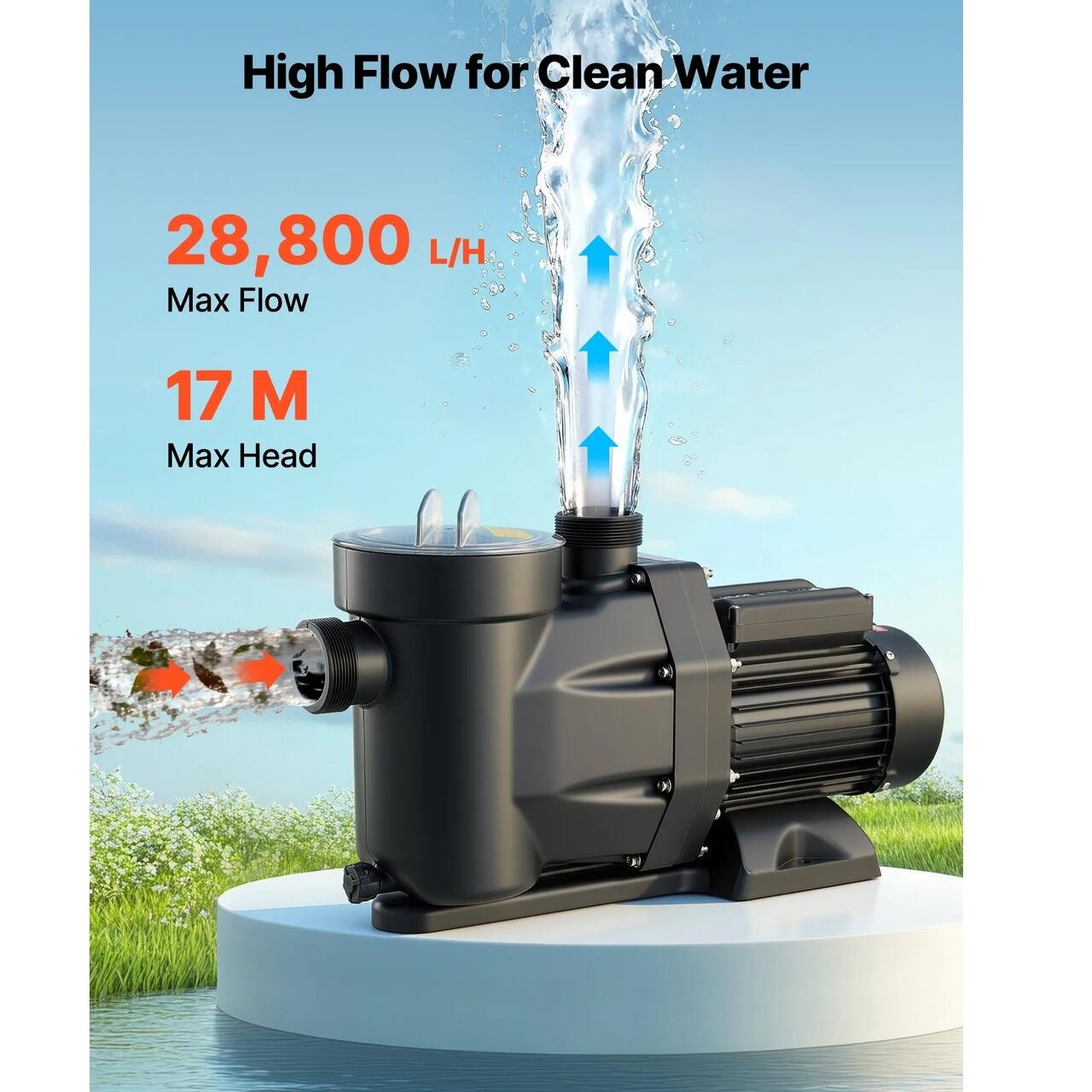 Pompa de piscina puternica de 1300 W: Aceasta pompa de filtrare pentru piscina este dotata cu un motor din cupru pentru o functionare stabila, de inalta performanta si silentioasa. Cu un debit maxim de 28.800 L/h si o inaltime maxima de 17 m, ofera o circulatie eficienta a apei pentru o experienta de inot curata.