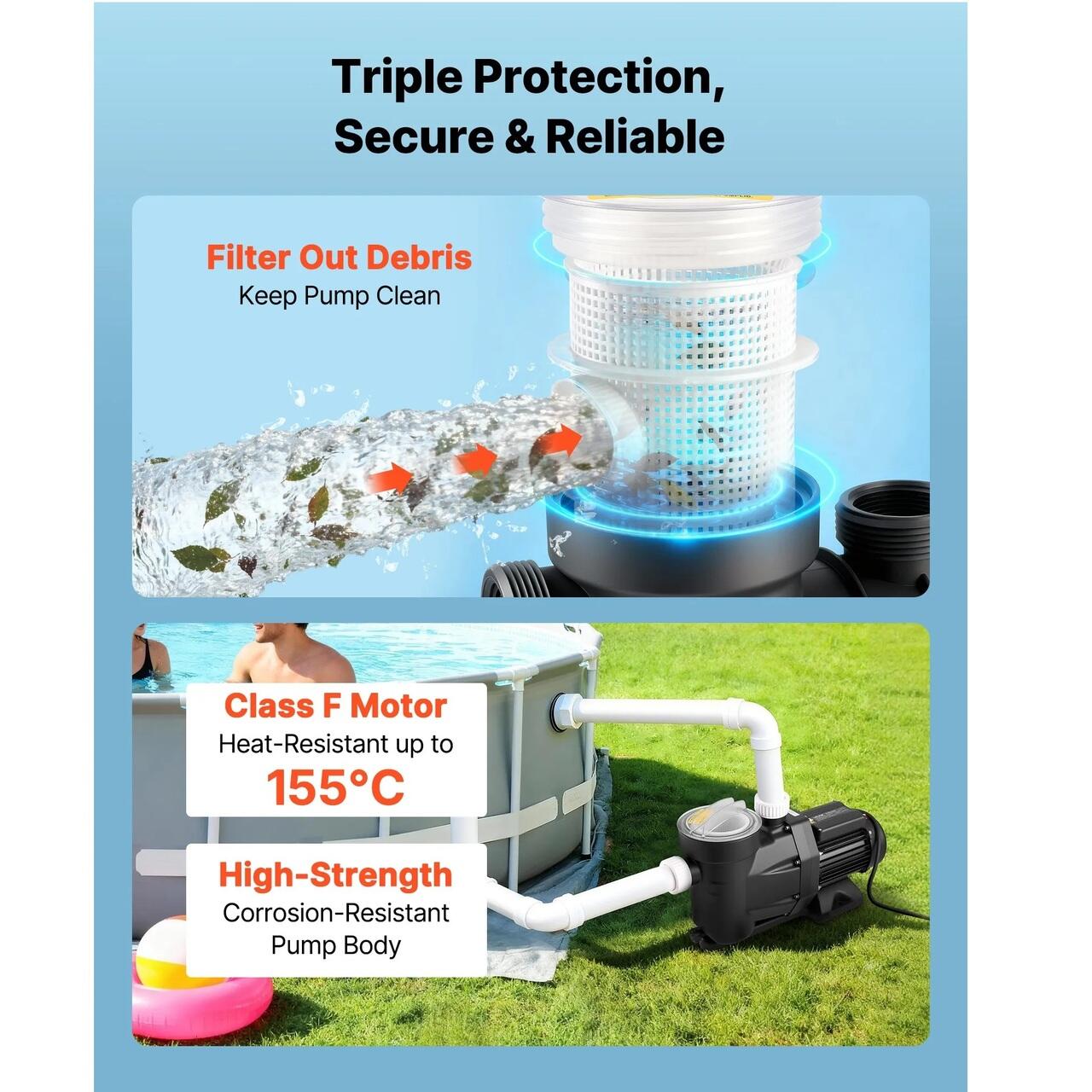 Protectie multistrat: Echipata cu un cos de filtrare mare pentru prefiltrarea reziduurilor si extinderea intervalelor de curatare. Aceasta pompa de piscina este construita cu o carcasa termoplastica ranforsata, plus un motor rezistent la apa IPX5 si clasa F pentru o functionare fiabila.