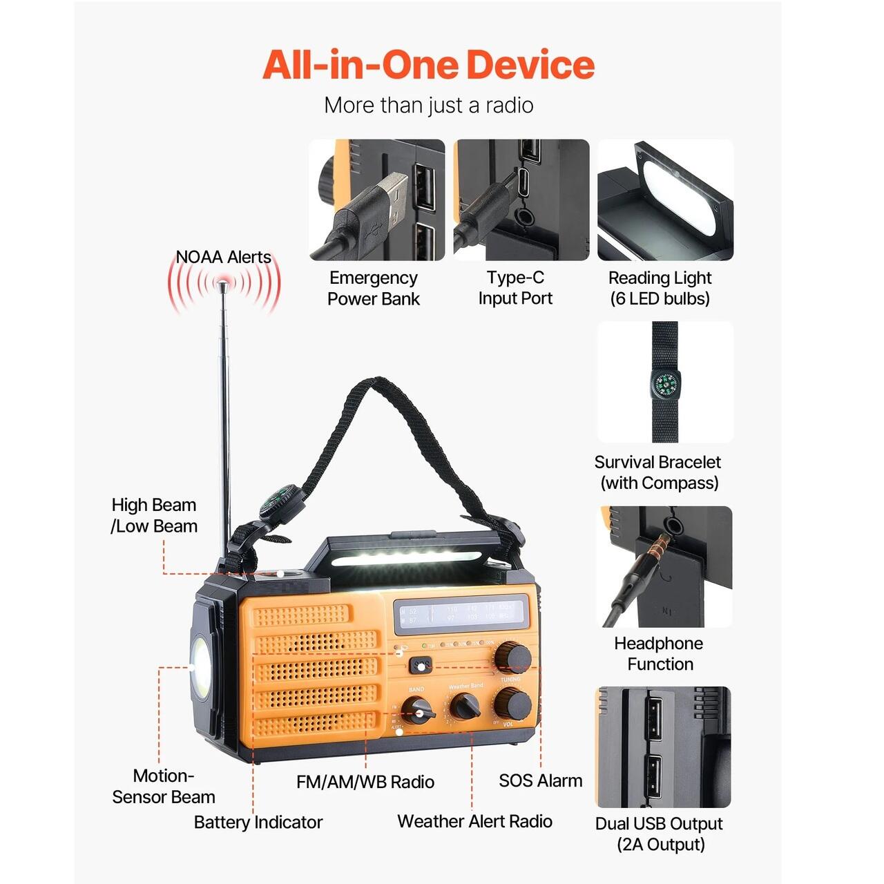 Radio portabil de urgenta, Acumulator, USB, panou solar, manivelă și opțiuni de baterii AAA, Lanterna 19 W, Alerte meteo NOAA, Alarmă SOS