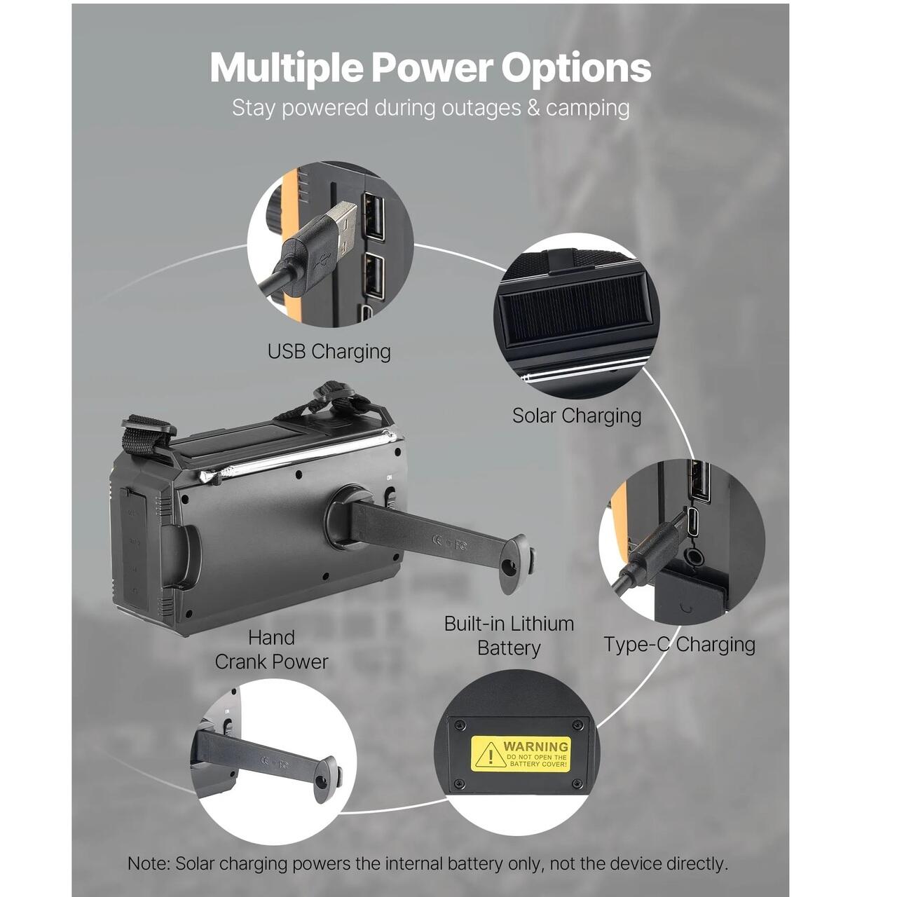 Surse multiple de alimentare: Baterie incorporata, incarcare USB, panou solar, manivela si optiuni de incarcare de tip C mentin radioul meteo de urgenta NOAA in functiune pentru camping, pene de curent si situatii de urgenta, fara teama de a intrerupe alimentarea.