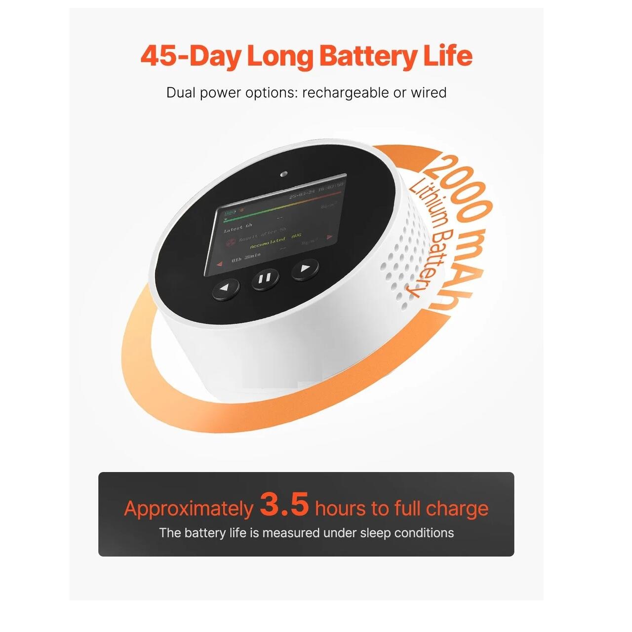 Putere de lunga durata: Folositi detectorul de radon cu sau fara cablu de alimentare. Dotat cu o baterie litiu de 2000 mAh, ofera pana la 45 de zile in standby si se incarca complet in 3,5 ore, ideal pentru diverse nevoi de utilizare.