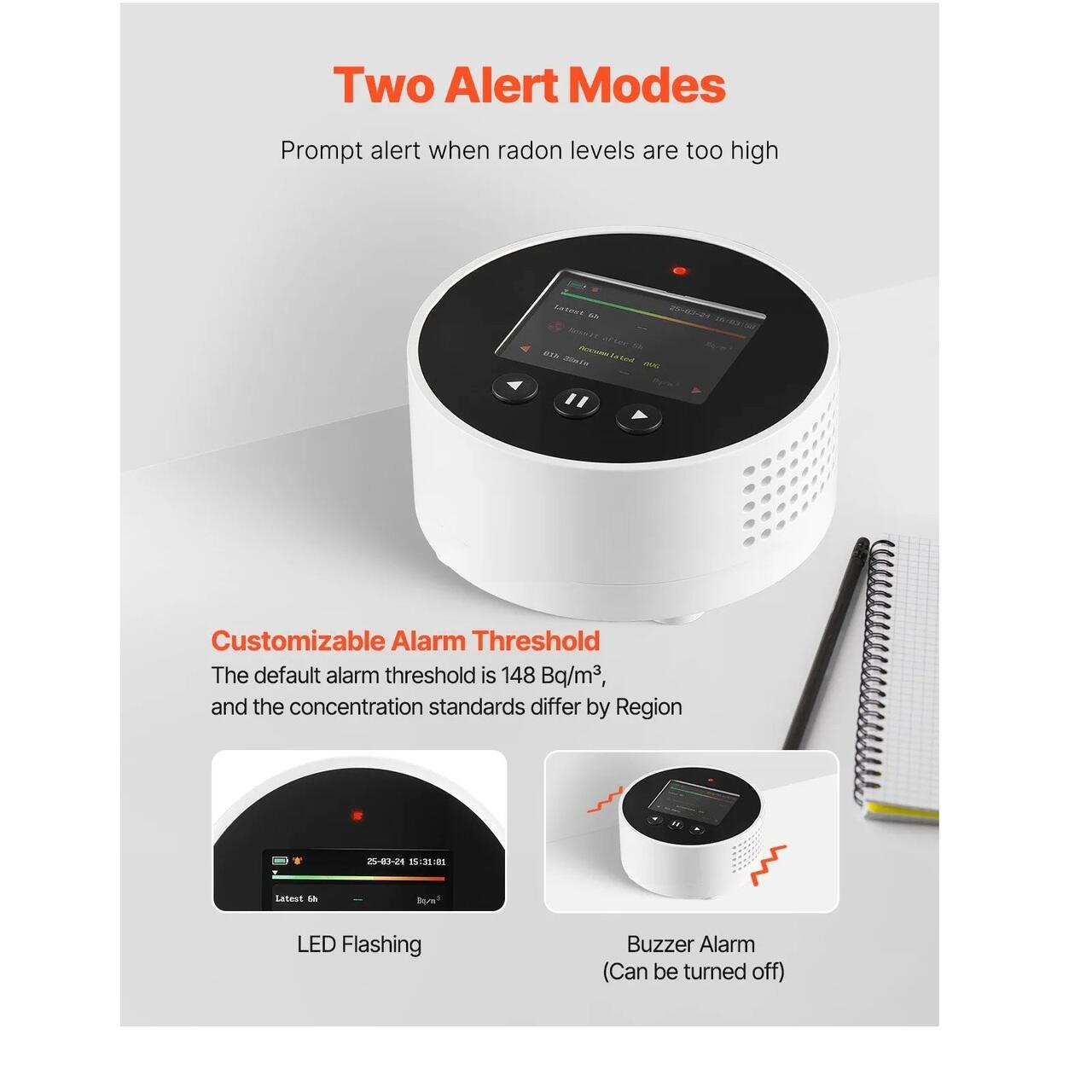 Moduri de alarma duble: Alarmele LED intermitente si buzzer se activeaza imediat ce radonul atinge niveluri periculoase. Puteti ajusta manual pragul de alerta in functie de cerintele locale de securitate.