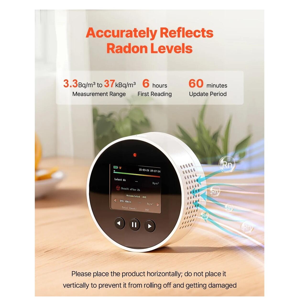 Detectare precisa: Detectorul de radon are un senzor semiconductor pentru a reflecta cu precizie nivelurile de radon. Masoara de la 3,3 Bq/m³ la 37.000 Bq/m³ (0,09 pana la 1000 pCi/L). Primele rezultate sunt afisate in 6 ore, se actualizeaza orar. Accepta perioade de 24h, 48h, 72h si 96h.