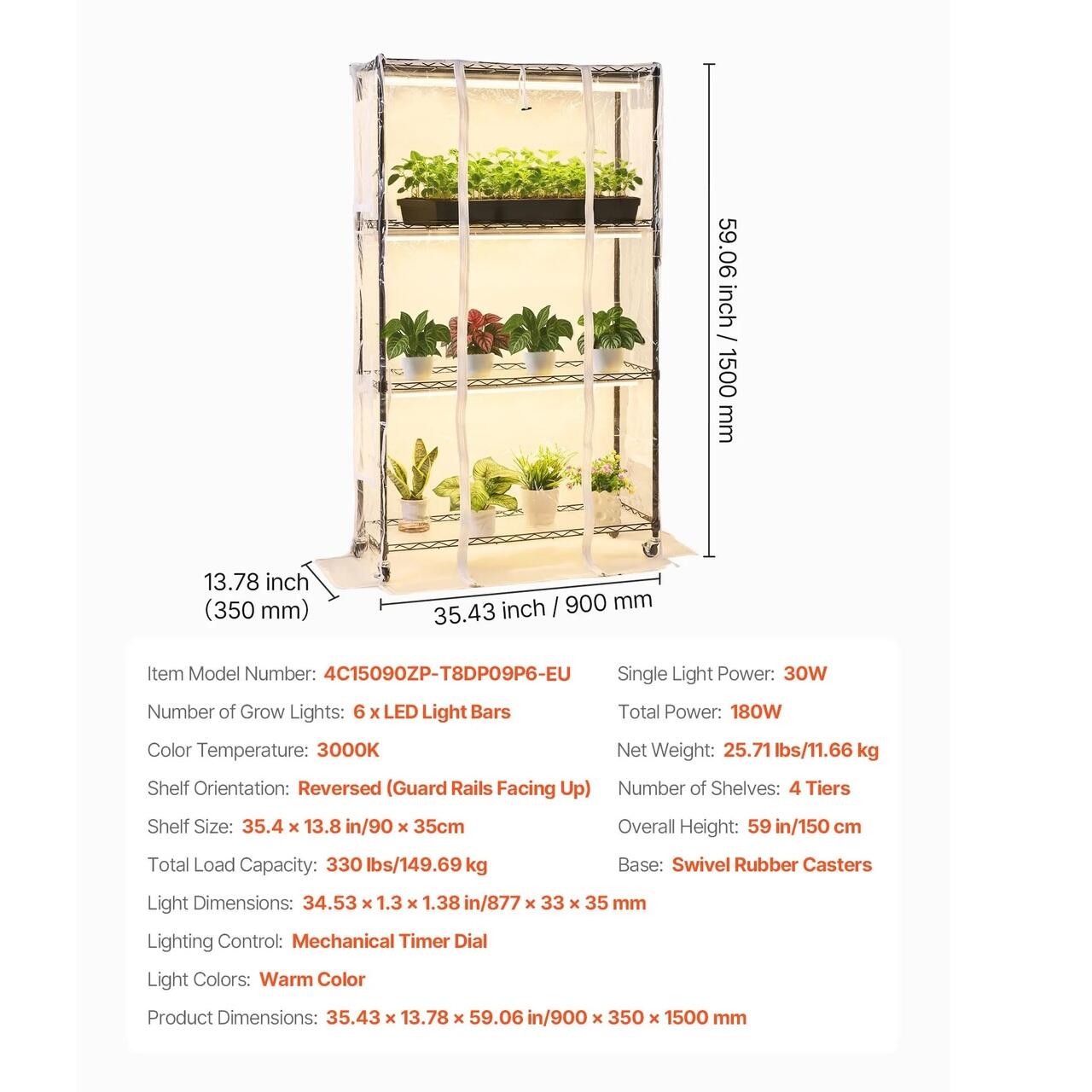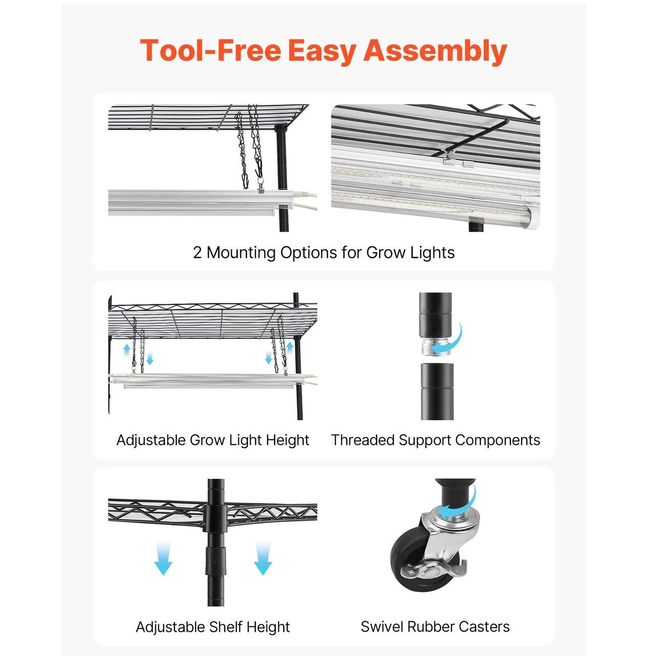 Asamblare si mobilitate usoara: Sera de interior cu lumina de crestere vine cu toate accesoriile necesare pentru o instalare rapida, fara unelte. Rafturile reglabile se potrivesc plantelor de diferite inaltimi. Patru roti pivotante rezistente fac mutarea suportului fara efort.