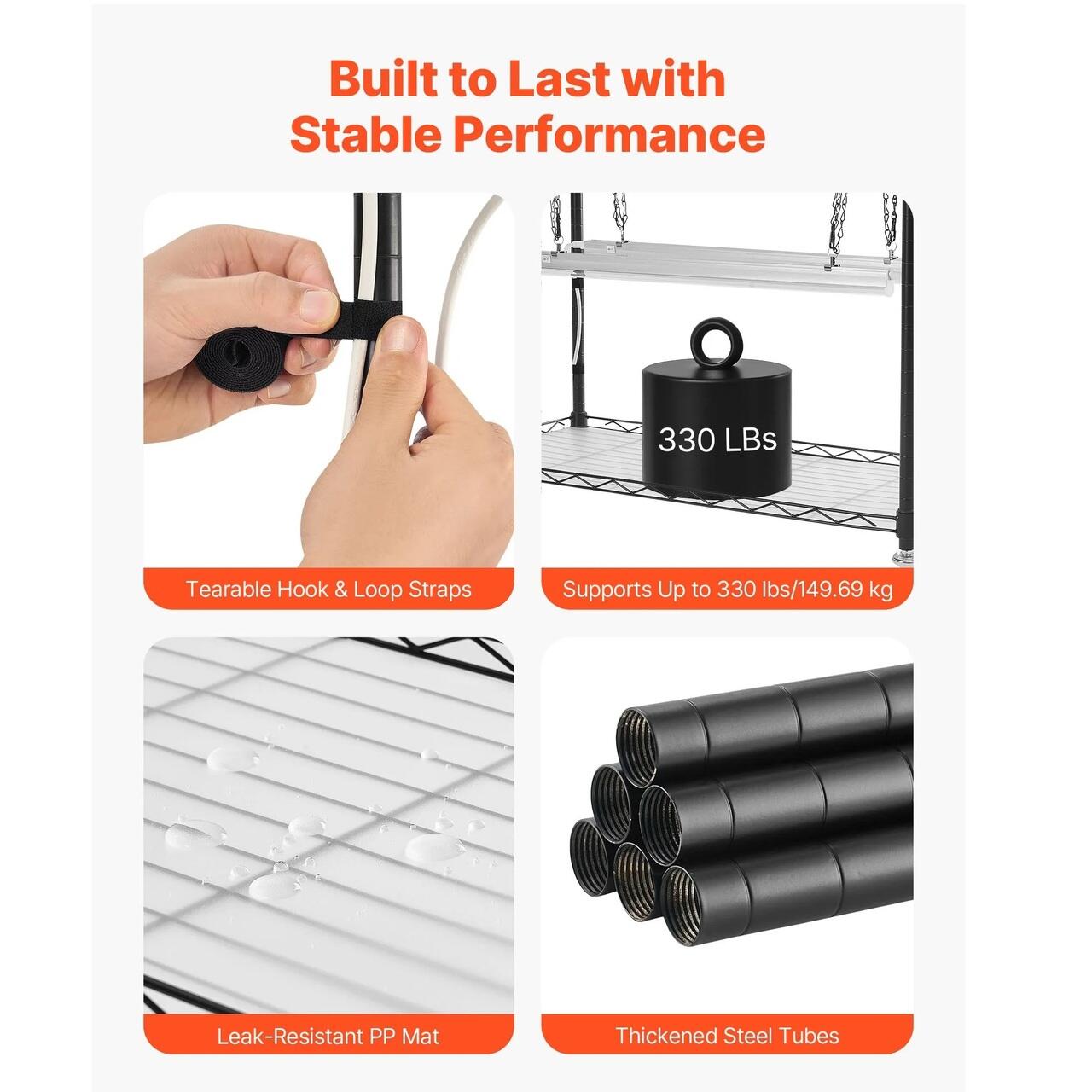 Puternic si durabil: Fabricat din tuburi de fier rezistente de 0,9 mm, acest suport pentru plante sustine pana la 150 kg. Vopsit in camp electrostatic pentru a rezista la rugina. Tavile etanse din PP protejeaza componentele electrice de apa, in timp ce curelele incluse fixeaza plantele la locul lor.