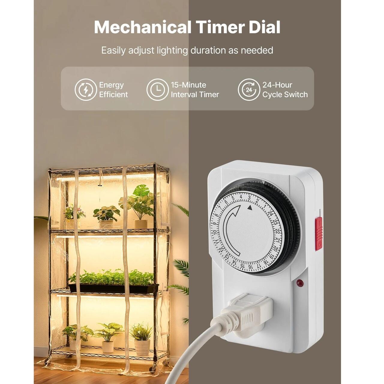 Temporizator mecanic: Suportul pentru plante de interior cu lampa de crestere dispune de un temporizator programabil incorporat de 24 de ore, cu intervale de 15 minute, pentru o utilizare usoara. Setati o data pentru pornirea/oprirea automata zilnica, asigurand ca plantele primesc cicluri de iluminare consistente si eficiente din punct de vedere energetic.