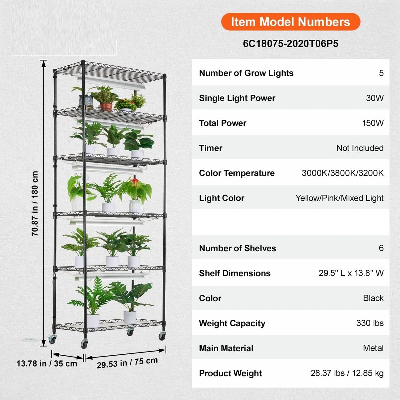 Suport robust pentru cresterea plantelor: Acest raft pentru plante din otel de inalta densitate, cu lumina de crestere, se mandreste cu o rezistenta excelenta la rugina si oxidare, avand dimensiuni de 75 x 34 x 180 cm si dispune de 6 rafturi cu dimensiunile de 75 x 34 cm fiecare. Suporta pana la 150 kg, permitandu-va sa expuneti vertical mai multe plante intr-un spatiu compact. Echipat cu trei setari de lumina reglabile, pur si simplu apasati controlerul pentru a incepe aventura de plantare.