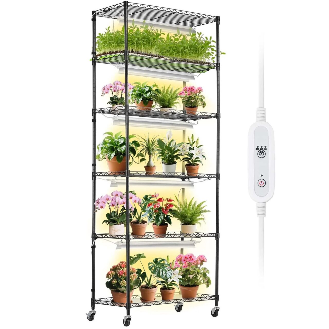 Raft pentru plante cu lampa de crestere 6 x Niveluri, Inaltime 180 cm, 3 x led, temporizator, 4 x Roti