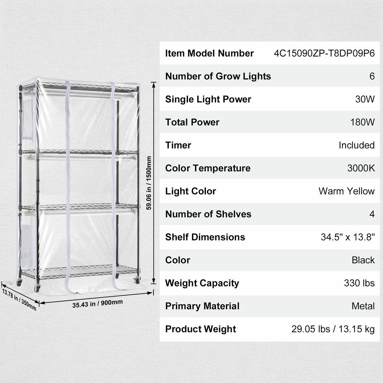 Capac pentru sera si higrometru incluse: Acest suport robust pentru plante include un capac pentru sera fabricat din material EVA durabil, asigurand caldura si niveluri de umiditate in interior. Capacul cu transparenta ridicata va permite sa monitorizati cresterea plantelor chiar si in conditii dure, creand un mediu umed si cald pentru plantele dvs. Suportul masoara 99 x 35 x 140 cm cu 4 rafturi, fiecare de 99 x 35 cm, si o capacitate totala de greutate de 150 kg, permitand expunerea verticala a plantelor in spatii compacte.