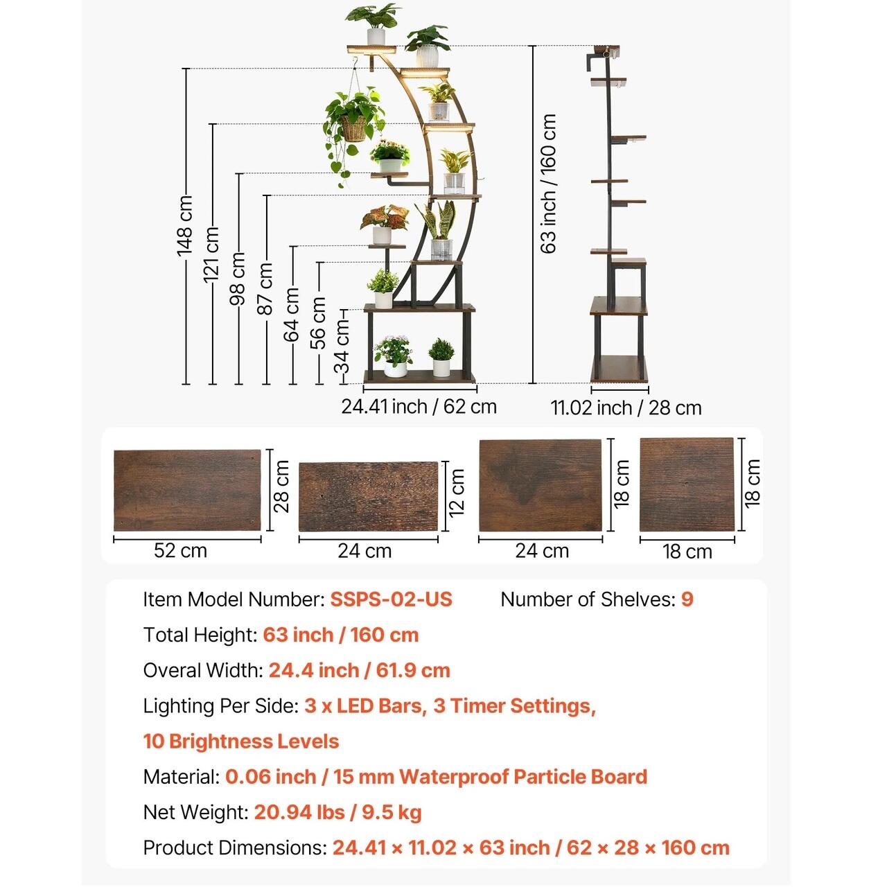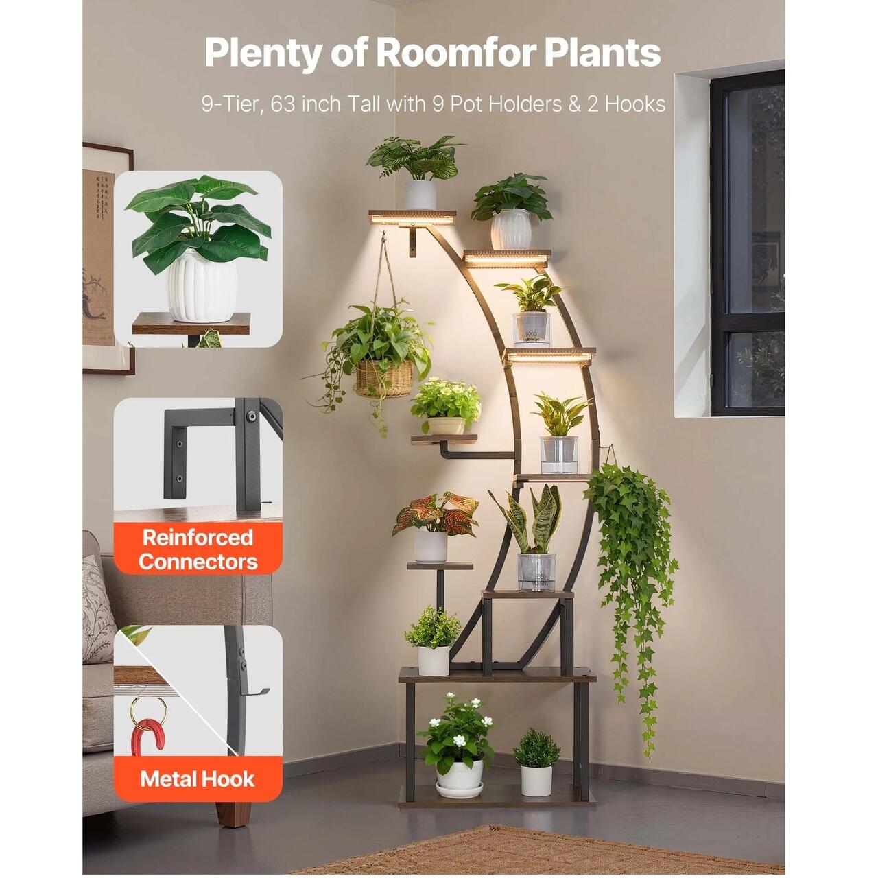 Suport pentru plante de interior cu 9 niveluri: Cu o inaltime de 155 cm, 9 rafturi si 2 carlige, acest suport pentru plante ofera spatiu amplu pentru a expune mai multe plante. Unele niveluri sunt suficient de late pentru a gazdui doua ghivece.