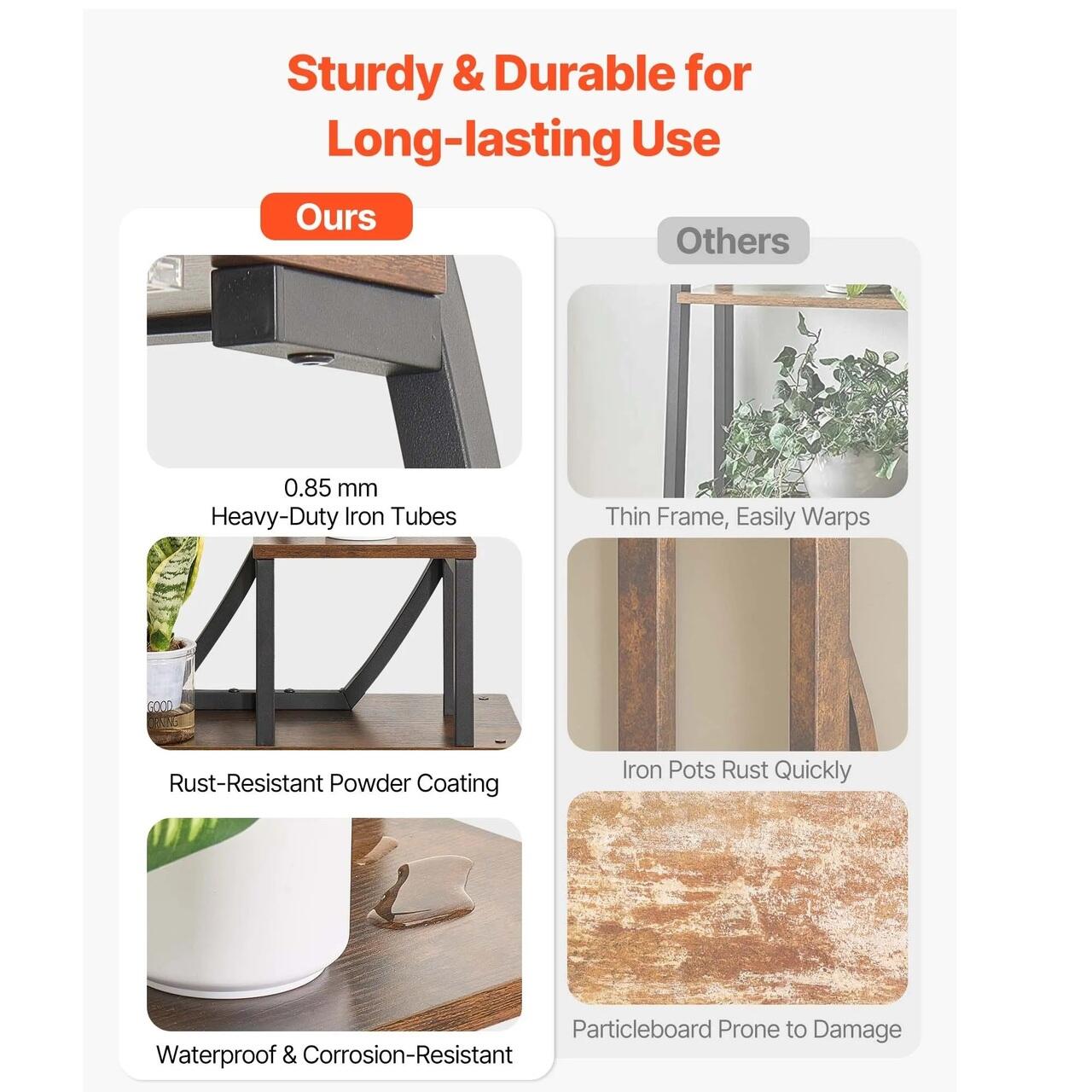 Robust si durabil: Construit din tuburi de fier de 0,85 mm cu vopsea electrostatica, suportul pentru plante cu lampa de crestere asigura o constructie robusta, rezistenta la sarcini grele si rezistenta la rugina. Placile aglomerate ranforsate, acoperite cu un strat impermeabil, evita coroziunea si deformarea.