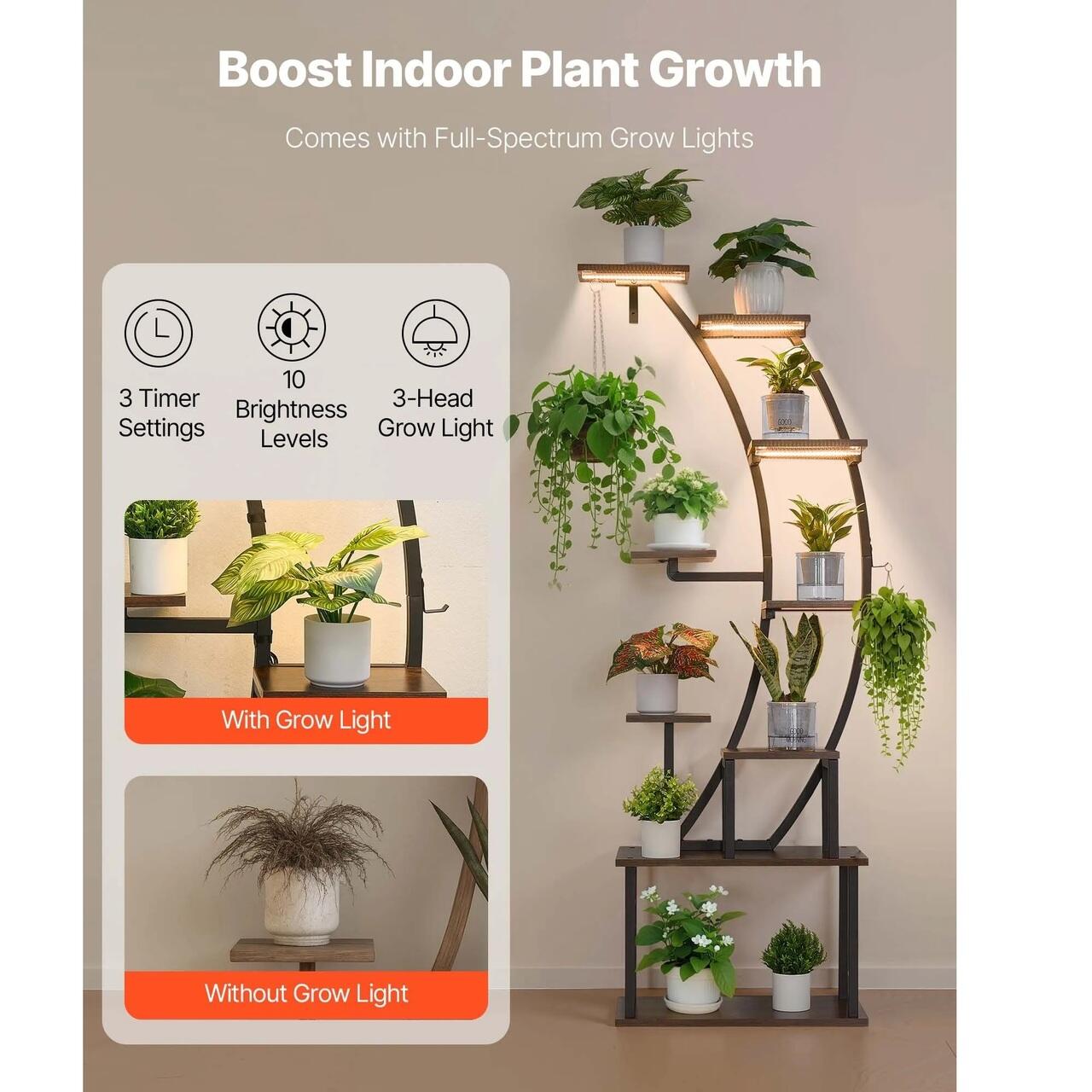 3 lumini de crestere cu spectru complet: Cu 3 lumini de crestere reglabile pentru a sustine o crestere sanatoasa in fiecare etapa, suportul pentru plante de interior asigura ca fiecare nivel primeste suficienta lumina. Cele 3 setari ale temporizatorului (3H/9H/12H) si 10 niveluri de luminozitate ofera diverse optiuni de iluminare.