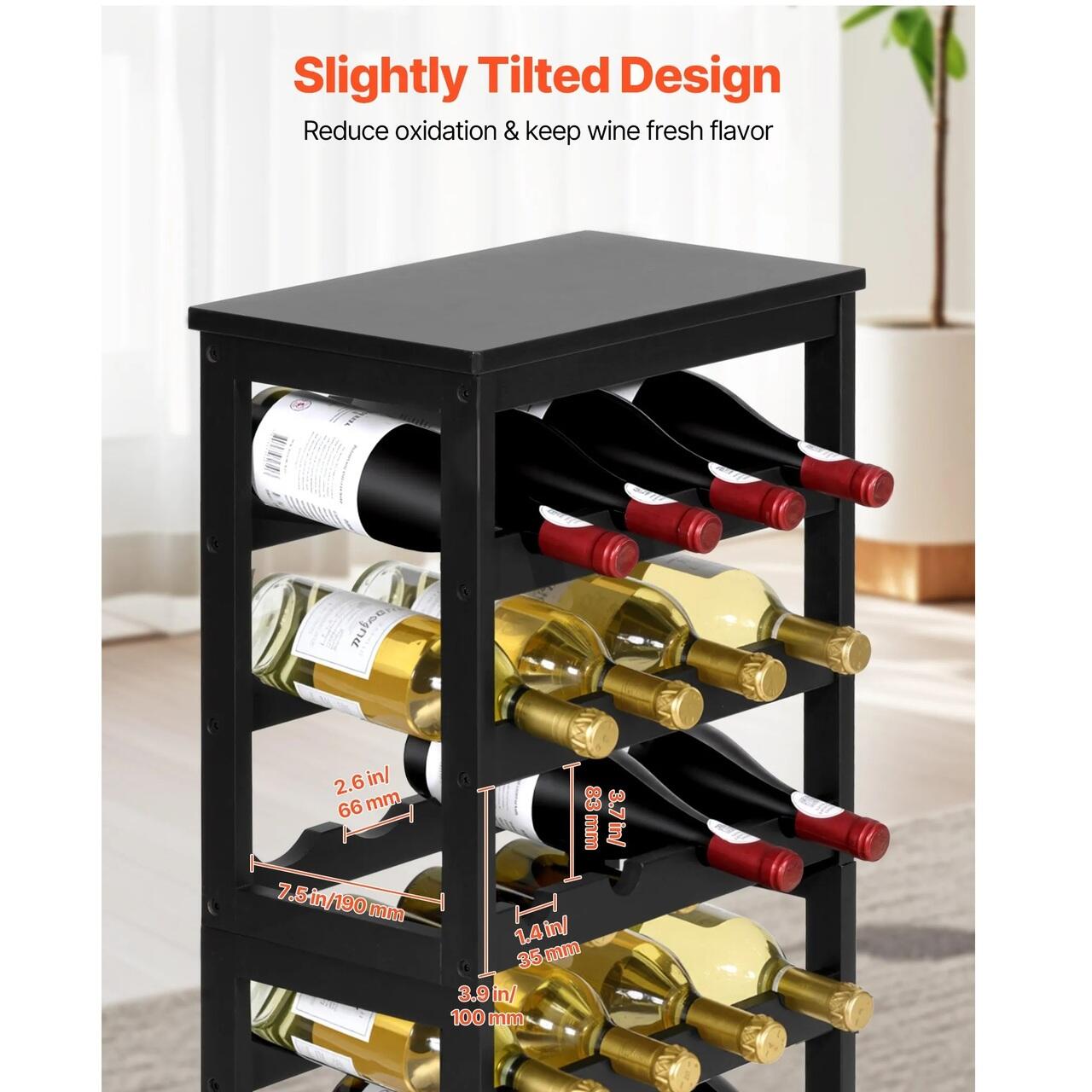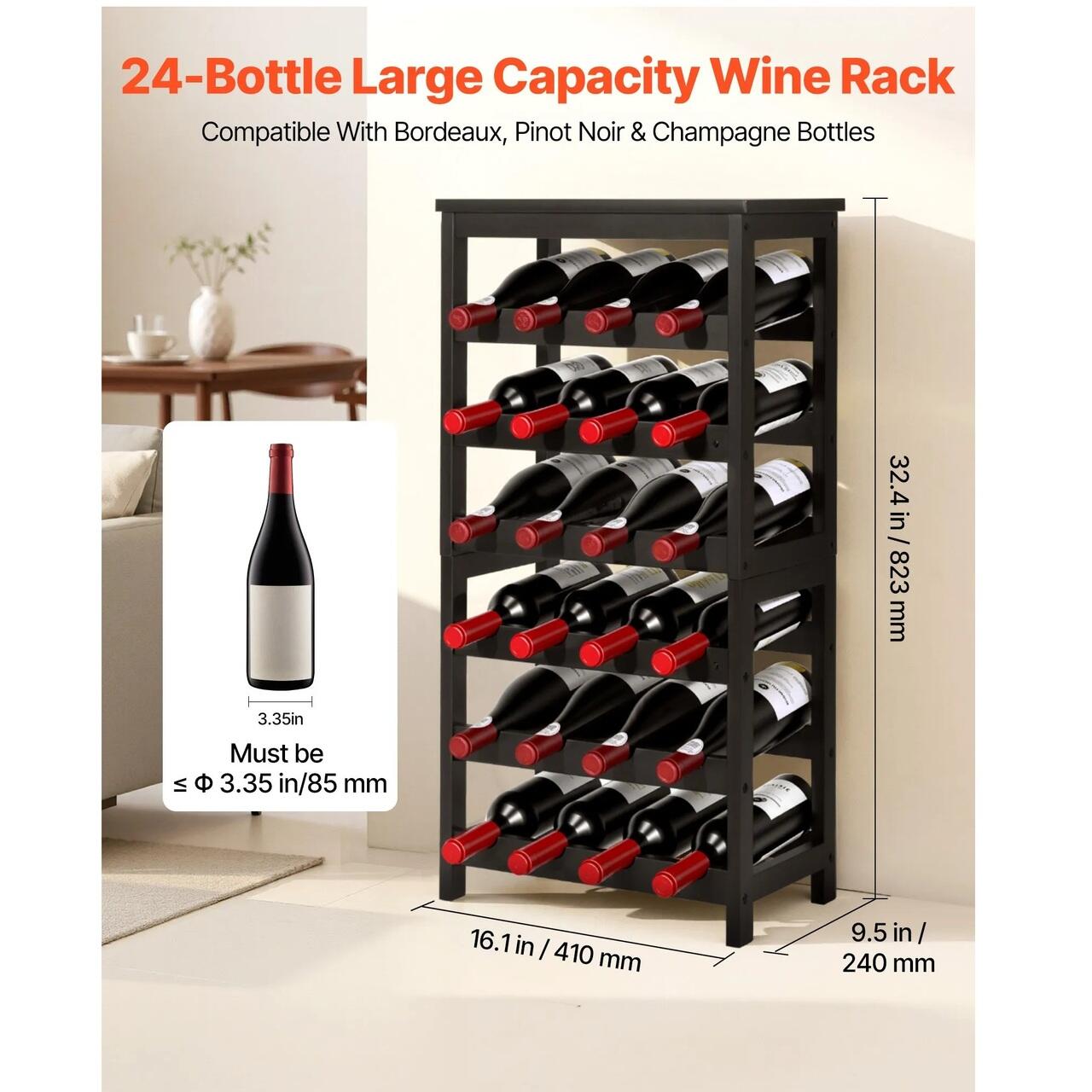 Plasare continua: Sticle de vin de dimensiuni standard (750 ml), cum ar fi Bordeaux si Champagne. Acest suport pentru sticle din bambus se potriveste la 90% din dimensiunile de sticle de pe piata. Spatierea dintre sectiunile suportului a fost marita la 1,9 cm, oferind suficient spatiu pentru stivuirea sticlelor de Pinot sau a sticlelor de sampanie.