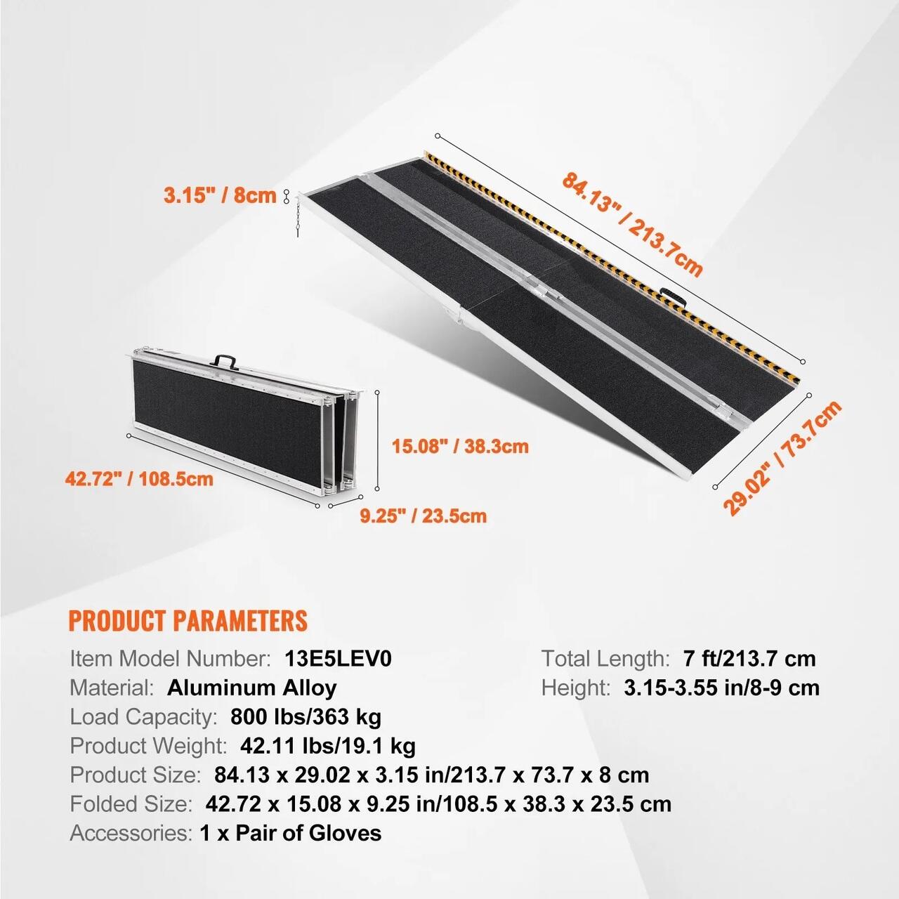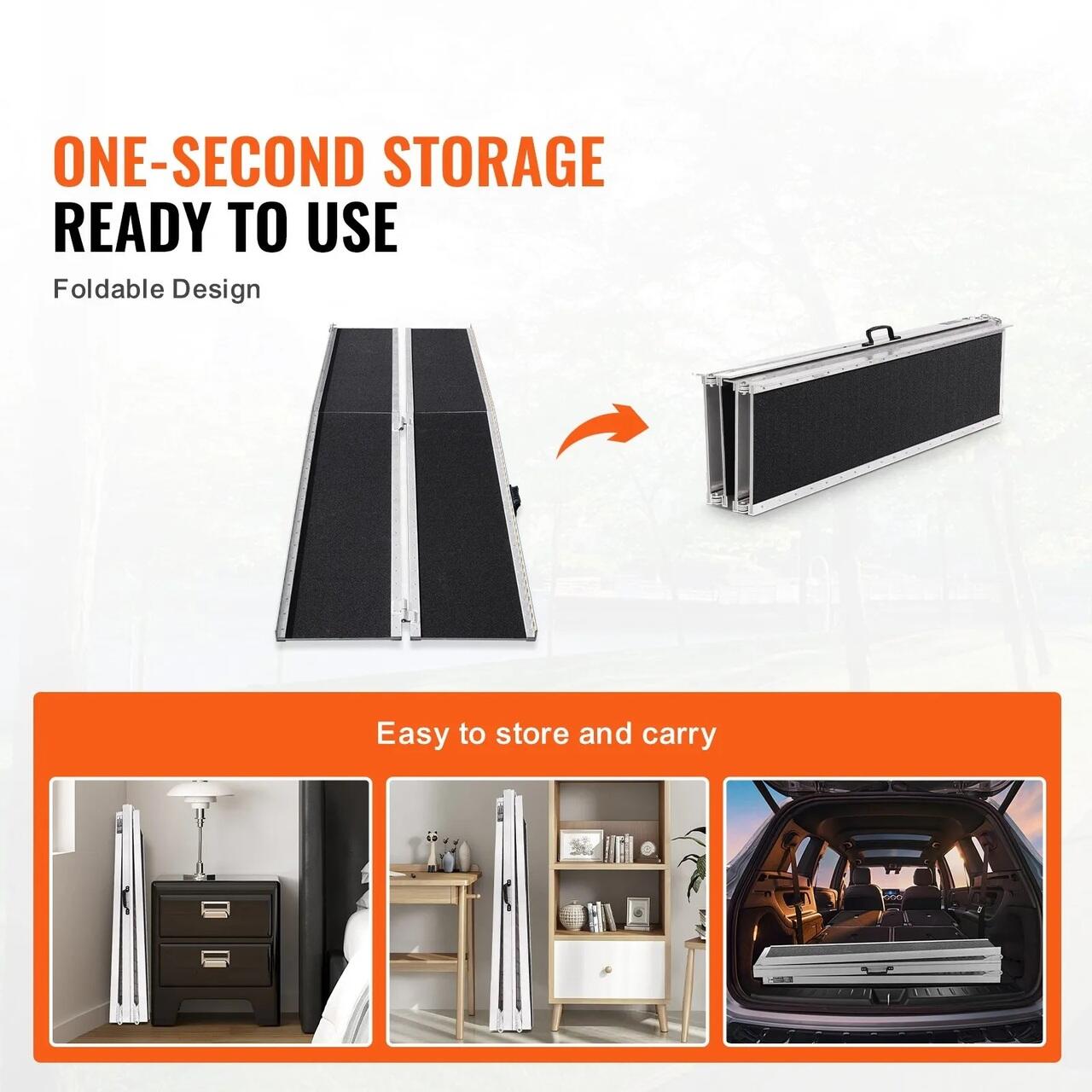 Design pliabil: Rampa noastra pliabila pentru scaune cu rotile este solutia suprema de mobilitate! Usor pliabila si cu un maner de transport convenabil, este conceputa pentru libertate in deplasare. Desfacuta, masoara 84,13 x 29,02 x 3,15 in / 213,7 x 73,7 x 8 cm, iar cand este pliata, este compacta, potrivindu-se perfect intr-un colt de acasa sau in portbagajul masinii.