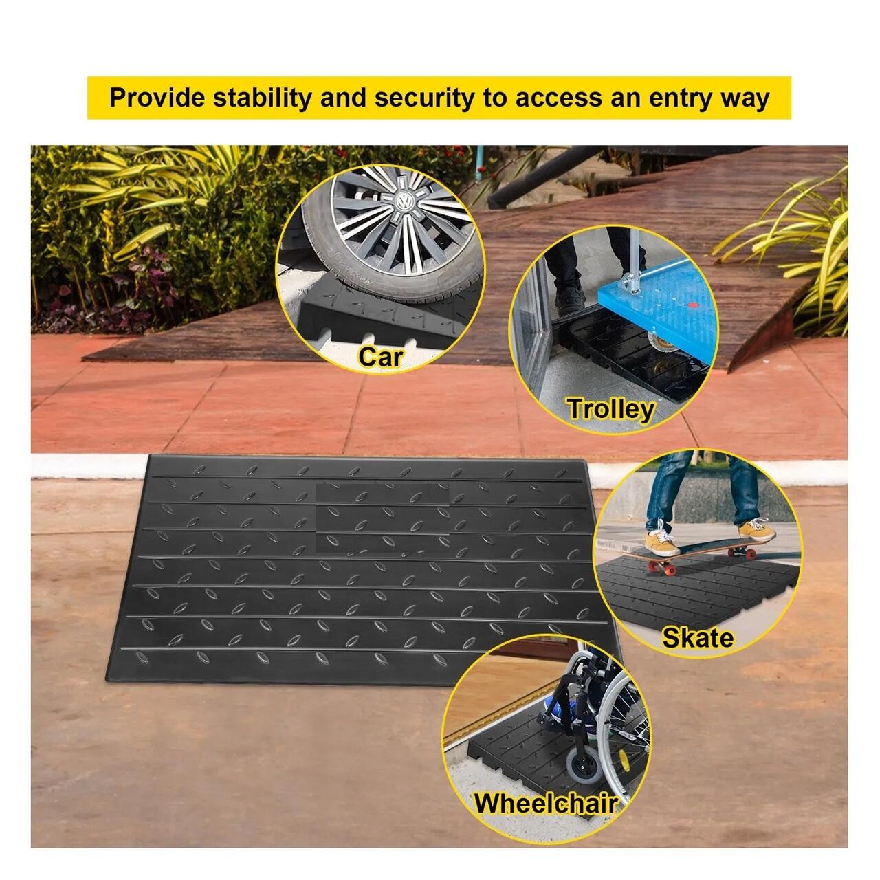 Capacitate de incarcare: Un cauciuc solid pentru pragul usii poate suporta pana la 1000 kg. Prin urmare, poate oferi stabilitate si securitate trecerii cu patine si scaune cu rotile si trotinete. Fabricate din cauciuc de calitate industriala, rampele de bordura pentru caile de acces permit, de asemenea, trecerea masinilor de uz casnic si nu se vor deforma usor.