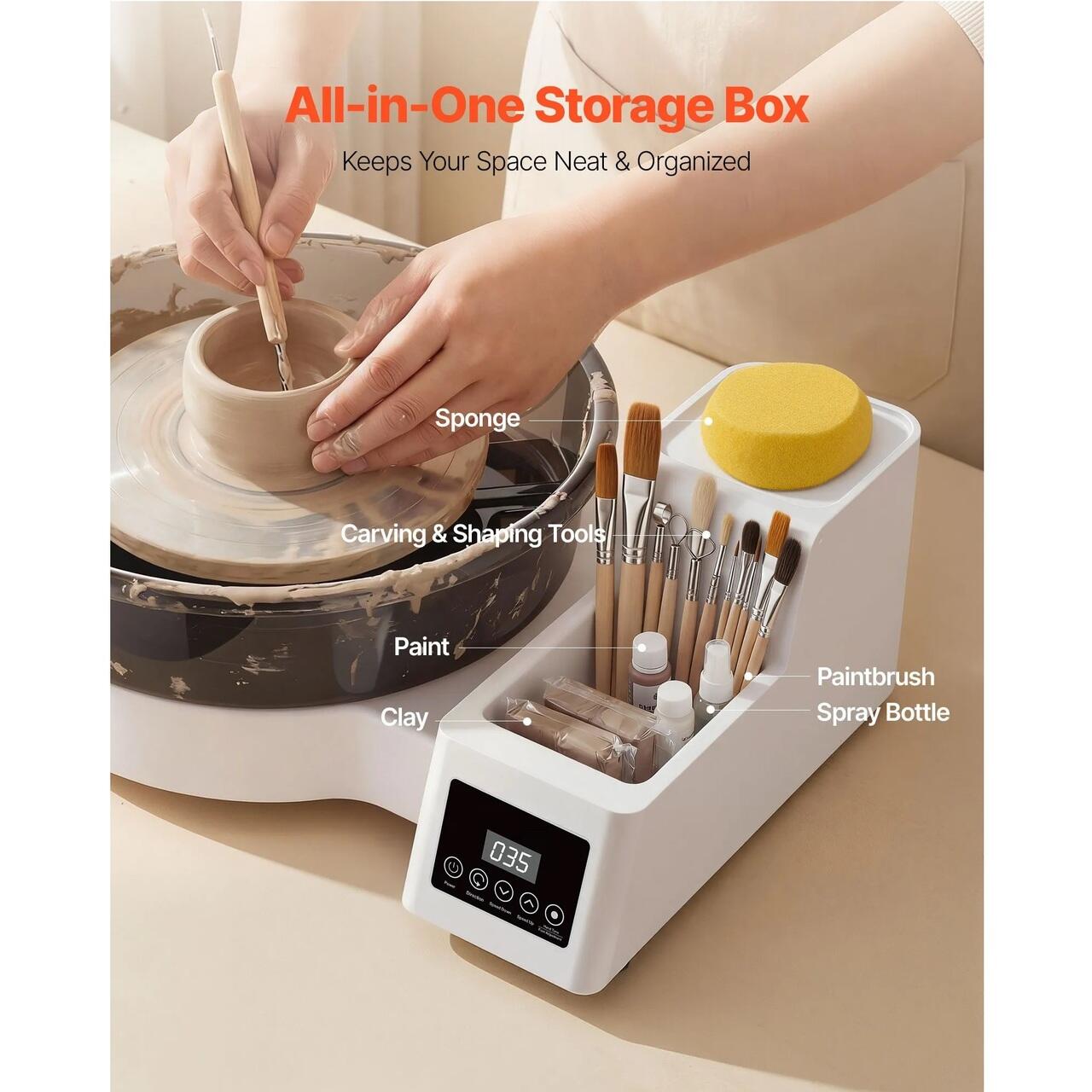 Depozitare integrata a uneltelor: Roata noastra electrica de olar va mentine concentrati asupra artei dumneavoastra. Cutia de depozitare cu doua straturi din partea dreapta tine uneltele de taiere, vopselele si alte obiecte esentiale la indemana, reducand dezordinea pentru un flux de lucru creativ lin si neintrerupt.