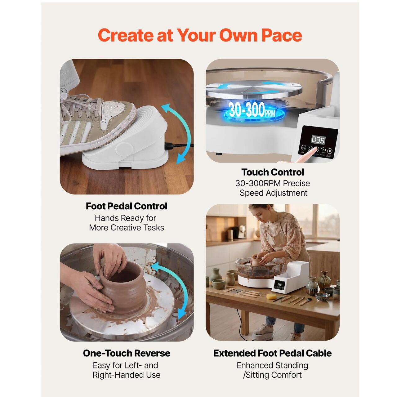 Pedala de picior receptiva: Pedala avansata cu efect Hall a rotii ceramice ofera o accelerare si o decelerare incredibil de lina, fara intarziere, de la 30 la 300 RPM, traducand miscarile subtile ale piciorului intr-un control precis pentru o expresie artistica detaliata.