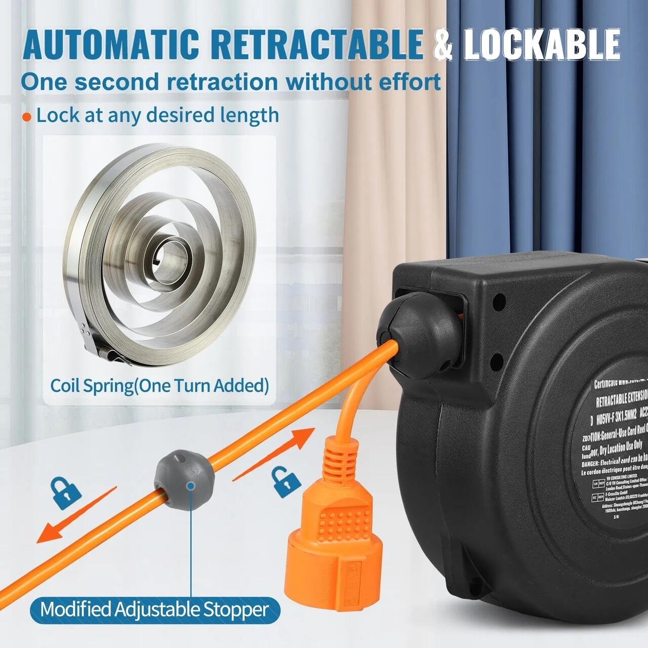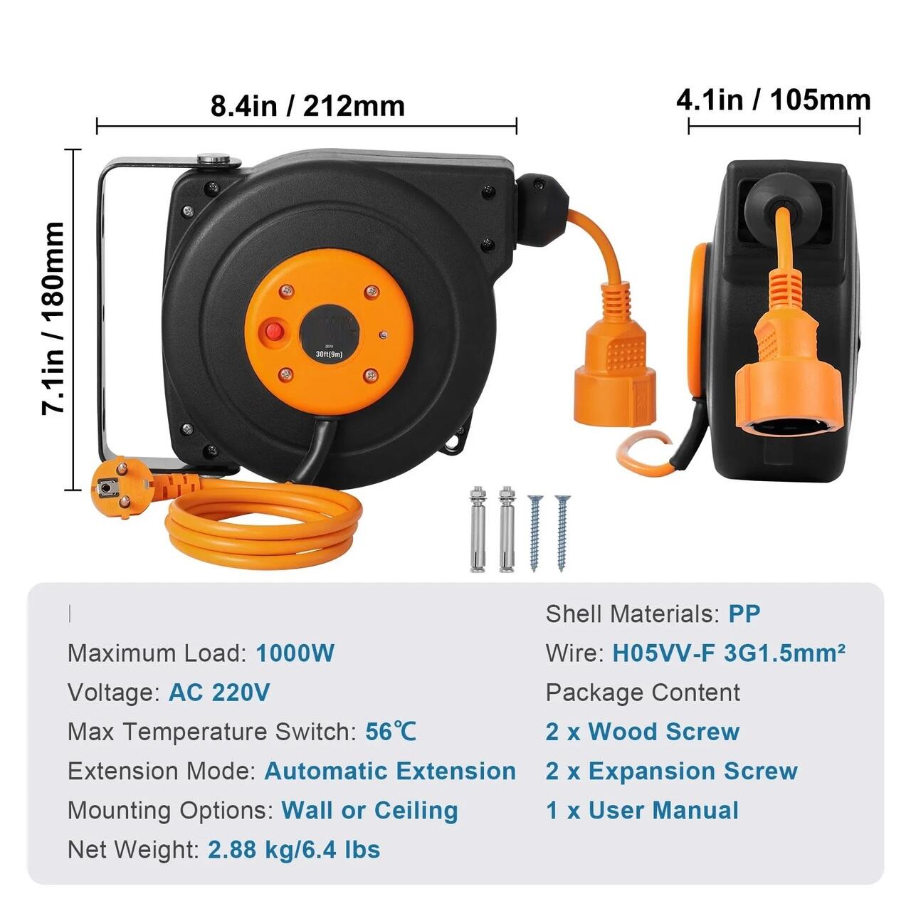Versatil si usor de utilizat: Perfect pentru montarea pe tavan sau pe perete, tamburul nostru retractabil pentru cablu va permite sa trageti si sa retrageti cu usurinta cablul din orice directie, eliberand spatiu valoros. Spuneti adio cablurilor incurcate si pericolelor de impiedicare - tamburul nostru pentru cablu prelungitor pastreaza totul depozitat in mod ordonat si la indemana, facand instalarea mai curata si mai eficienta.