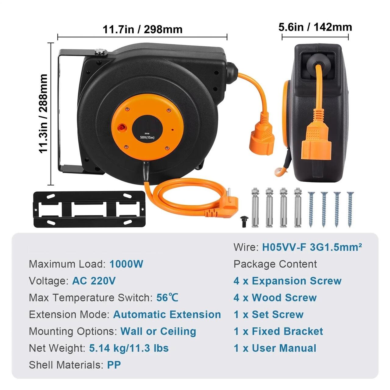 Prelungitor pe tambur retractabil, Fixare pe perete, max 1000 W, Suport pivotant, cablu 1.5 mmp, Lungime 15 m, Protectie supraincalzire